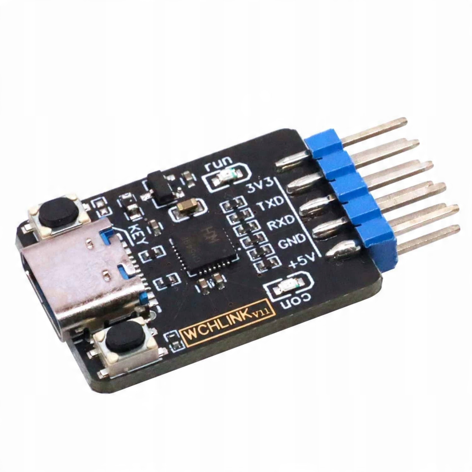 Программатор WCHlink предназначен для микроконтроллеров семейств ARM и RISC-V, оснащенных разъемом USB-C. Малогабаритный модуль может работать с напряжением 3,3 В и 5 В для питания микроконтроллера, а также может дополнительно использоваться в качестве последовательного порта для передачи UART. USB-C 2.0 гарантирует быструю передачу 30 КБ/с, одним нажатием кнопки мы переключаем режим работы между ARM (диод CON горит) и RISC-V (диод CON выключен). Зажмите кнопку «КЛЮЧ» и включите питание, режим работы должен измениться.