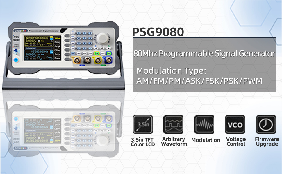 PSG9080 - произвольный генератор с программируемыми функциями. Он может генерировать синусоид, прямоугольную волну, треугольную волну, импульсную волну, произвольную волну и т. Д. Максимальный диапазон частоты устройства составляет 80 МГц, включая модуляцию формы волны, преобразование частоты, VCO, измерение частоты сигнала и функции программирования. Выходной сигнал, амплитуда, фаза, рабочий цикл и частота могут отображаться одновременно. Это обеспечивает новый выбор для образования, исследований и разработок, производства, тестирования и других отраслей.