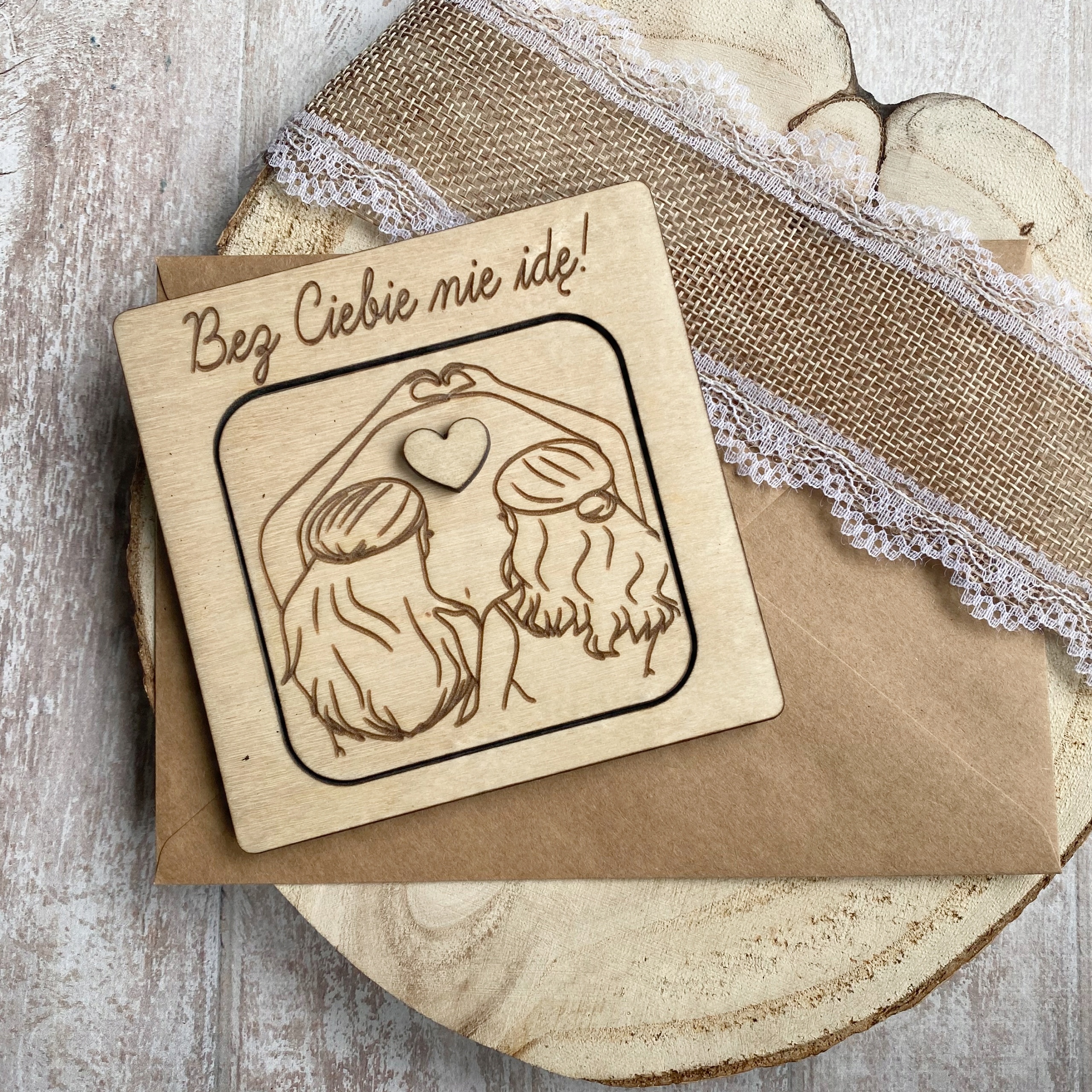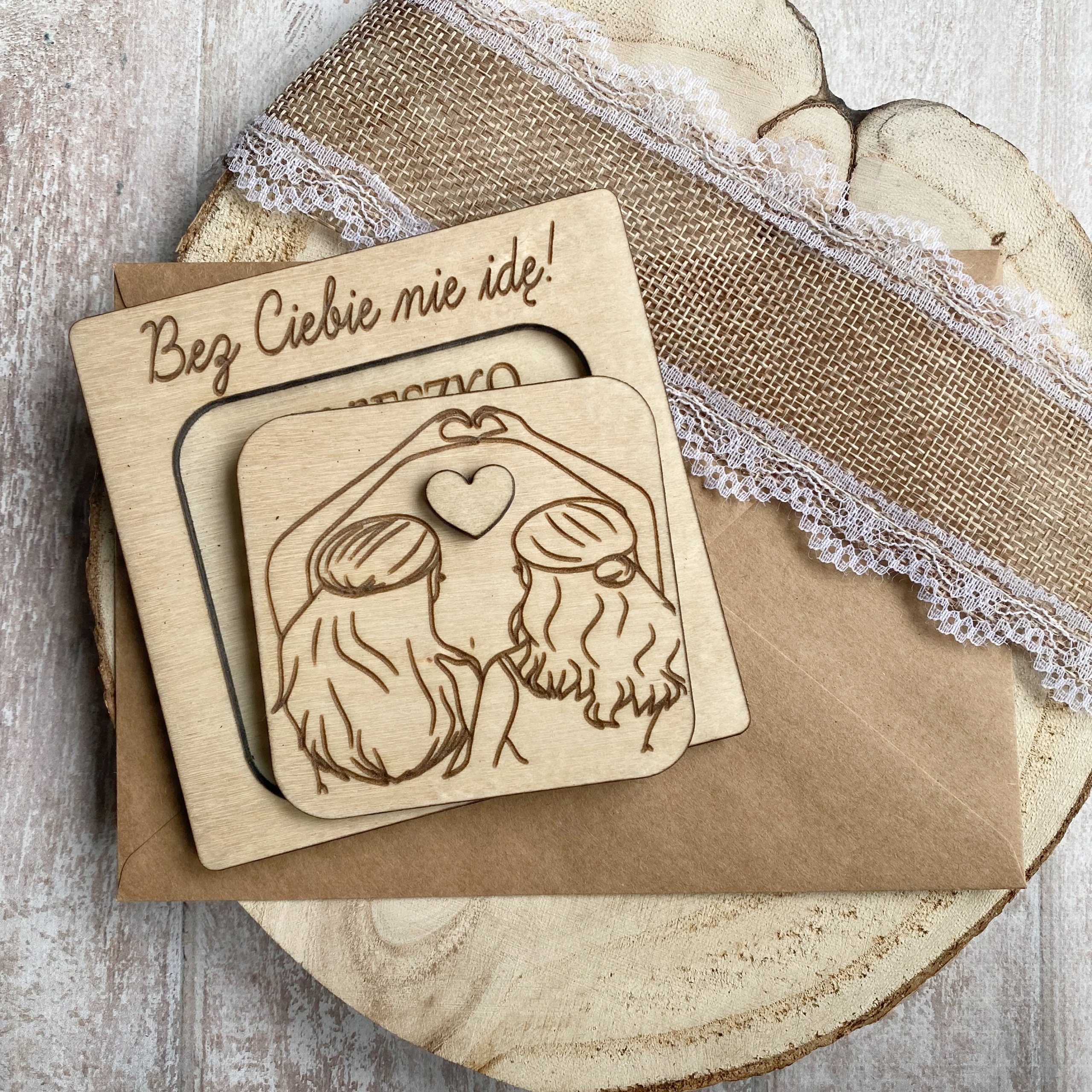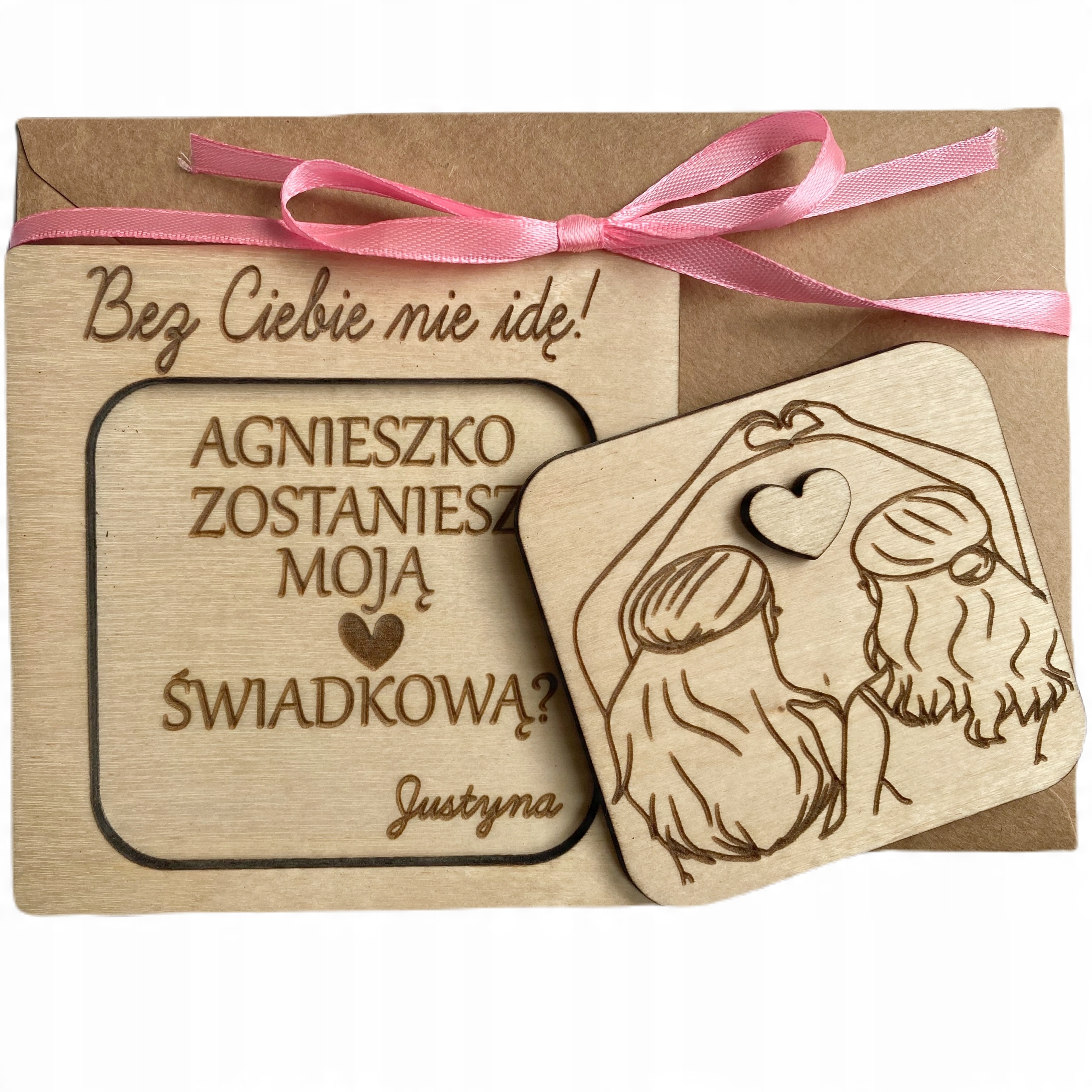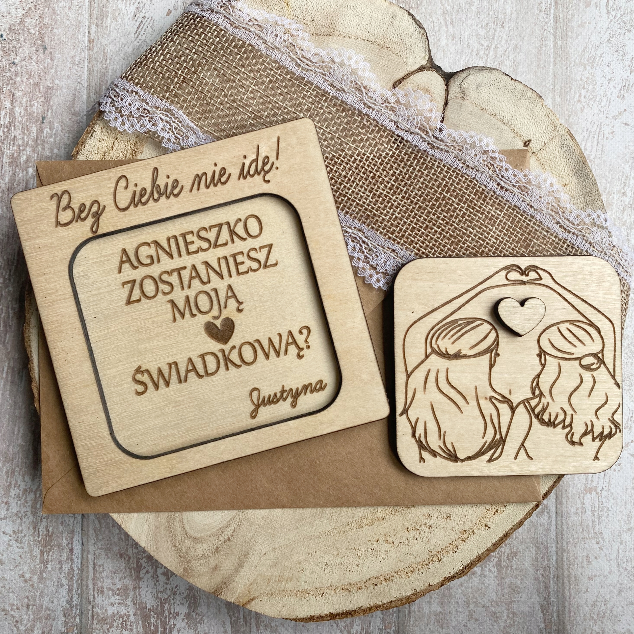 - Деревянная открытка с декоративным изображением «друзей» и сердечком, служащим ручкой. После раскрытия карты появляется надпись: ИМЯ СВИДЕТЕЛЯ+ «ТЫ БУДЕШЬ МОИМ СВИДЕТЕЛЕМ?» +ИМЯ невесты.