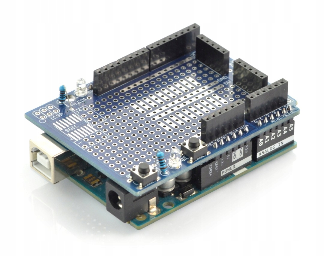 Перегрузка для Arduino Uno Rev3 и производные, которые позволяют вам создавать свои собственные системы (щиты). У него есть все разъемы и два светодиода и кнопку, которая будет использоваться пользователем. Кроме того, контактная пластина с 170 отверстиями в наборе.