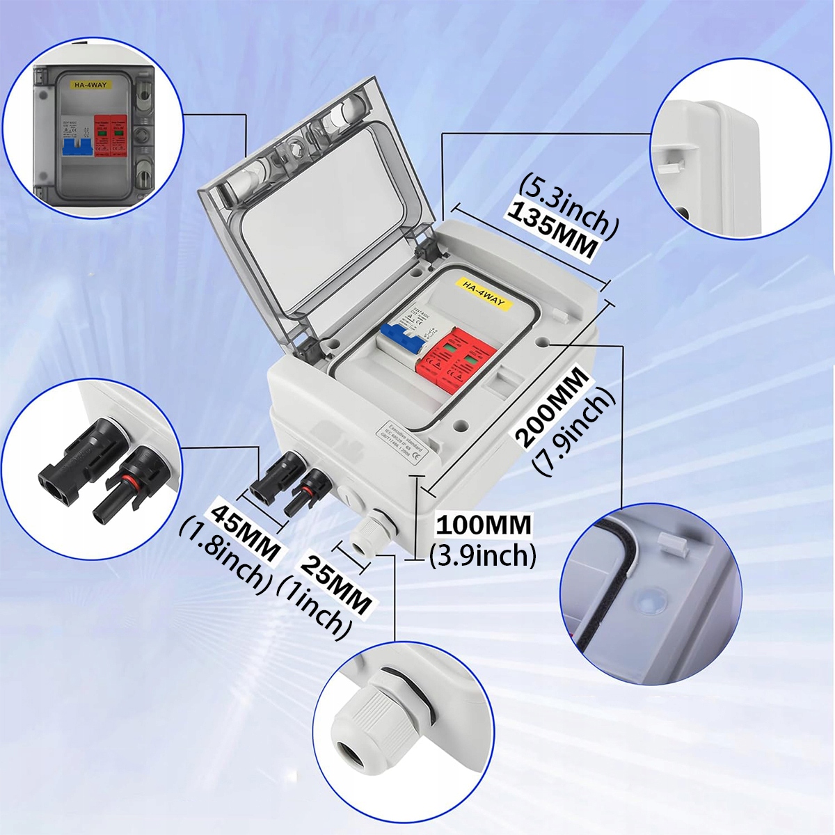 , поставляемый с разъемом MC-4, Plug and Play, предоставляет простое решение для соединения солнечных панелей, внутренняя проводка уже подключена, сохраняя не менее 1-2 часов по сравнению с ручной проводкой. Коробка управления оснащена прозрачной крышкой, которая позволяет визуально управлять основным состоянием переключателя и молниеносной защиты.