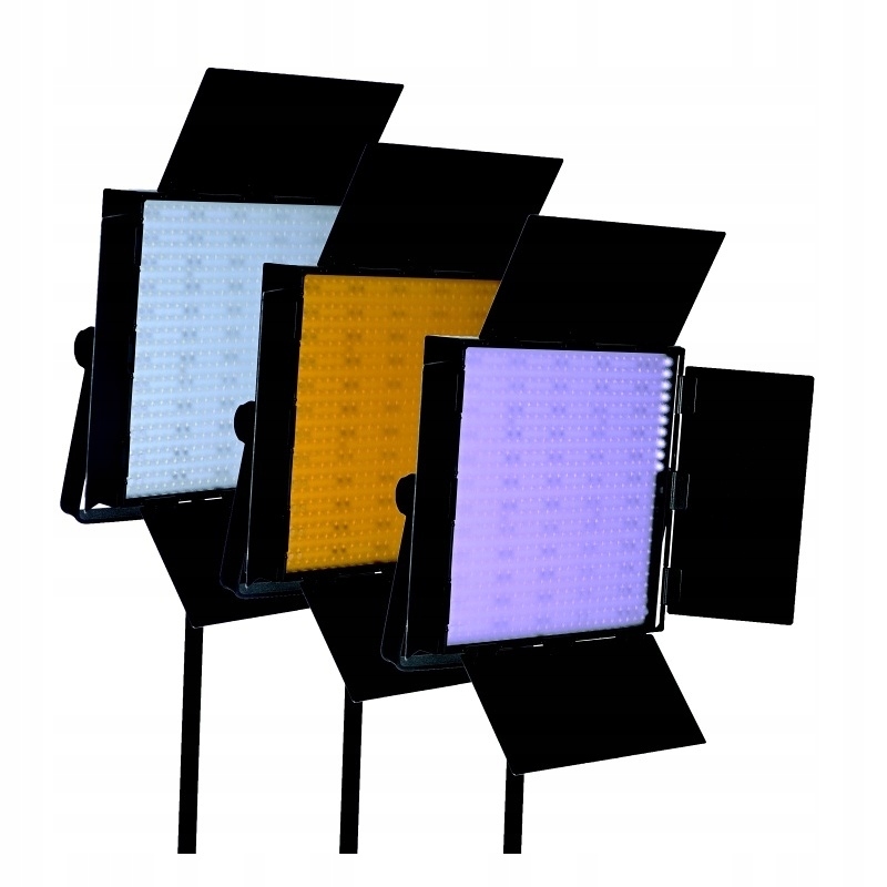 Светодиодная студийная лампа с 900 светодиодами, цветовой температурой 3200/5400K, световой мощностью 8820 Lux, регулировкой мощности 0-100%, AC/DC 14,8 В питания питания или V-блока для литий-ионных батарей, 54 Вт питания , интегрированные закрылки, фильтры для изменения цветовой температуры - желтый и пурпурный, область освещения 36x31см, размер 43x40x12 см, вес 2,7 кг. Современный студийный свет с необычайной долговечностью источника света