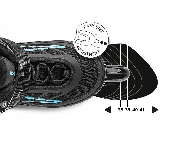 Роликовые коньки Movino Cruzer B2 оснащены быстрой и надежной системой регулировки размера с помощью одной кнопки. Четырехступенчатый диапазон между размерами 38 и 41 позволяет подогнать обувь на длину стопы от 24 до 26 см.