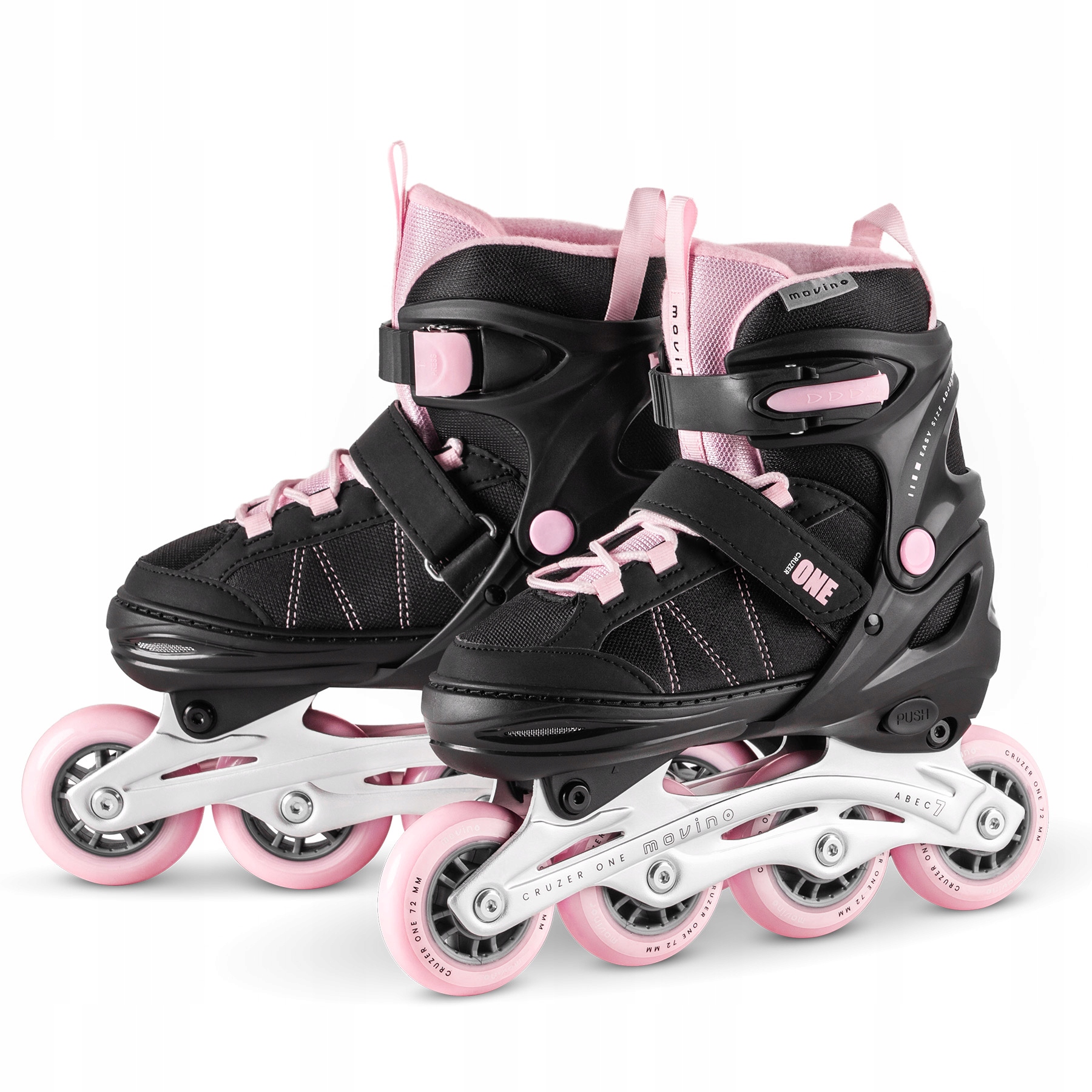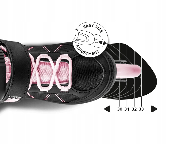 Movino Cruzer One Rollers имеют быструю и надежную систему регулировки размера с одной кнопкой. Четырехэтапный диапазон между размером 30-33 позволяет соответствовать обуви до ноги между 18-20 см