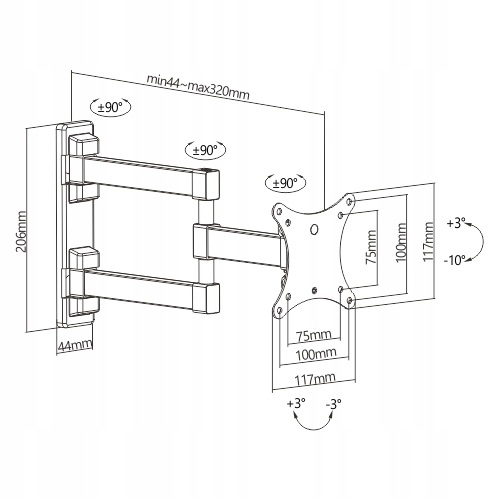 - Держатель с вылетом 32 см от стены до задней панели телевизора позволяет осуществлять угловую установку с регулировкой на 90 градусов в каждом направлении li>