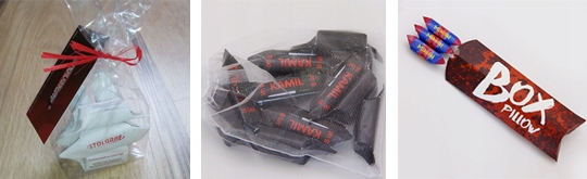 <р>1. целлофановые пакеты с дном (вмещает 5 конфет) <р>2. белые мешочки из органзы (вмещают 10-12 конфет) <р>3. коробочка-подушка с принтом (вмещает 10 конфет); размер коробки: 213x85x32 мм