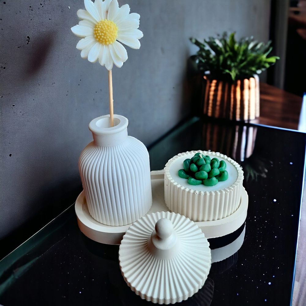 Основа: В комплект также входит прочная подставка, обеспечивающая устойчивое размещение как свечи, так и вазы. Благодаря этому вы сможете наслаждаться полным комфортом при использовании набора, не беспокоясь о том, что он сдвинется или опрокинется.
