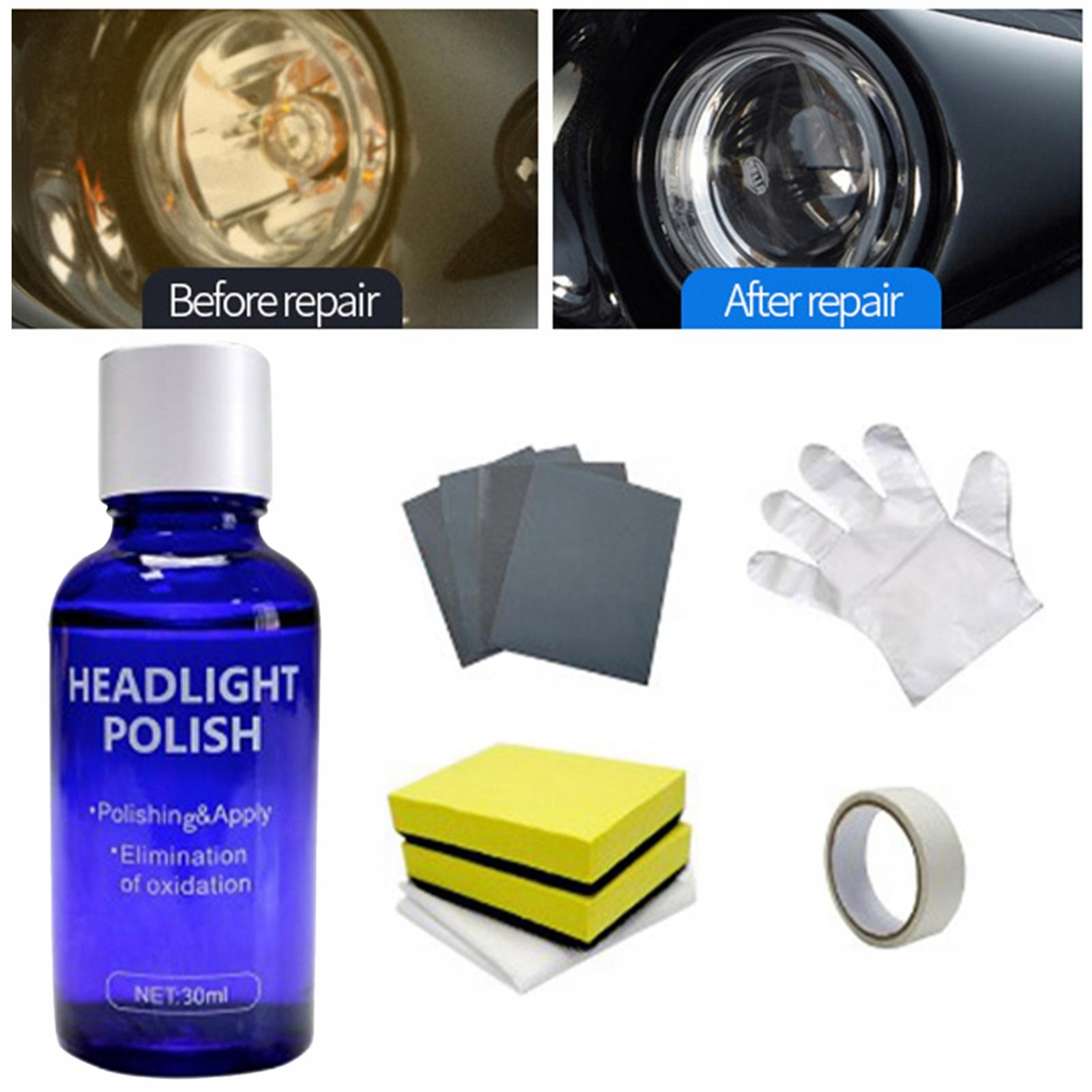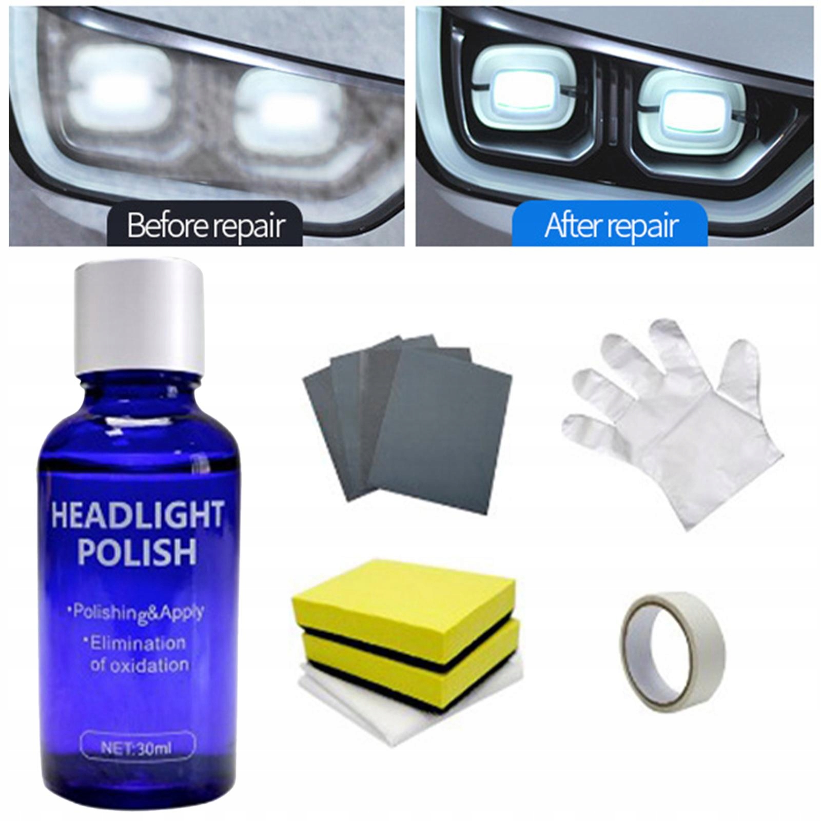 Комплект для ремонта фар: в этот комплект входит 1 бутылка жидкости для полировки фар, 2 чистящие губки, 2 тряпки, 4 наждачной бумаги, 2 одноразовые перчатки и 1 рулон ленты, которых достаточно для полировки фар