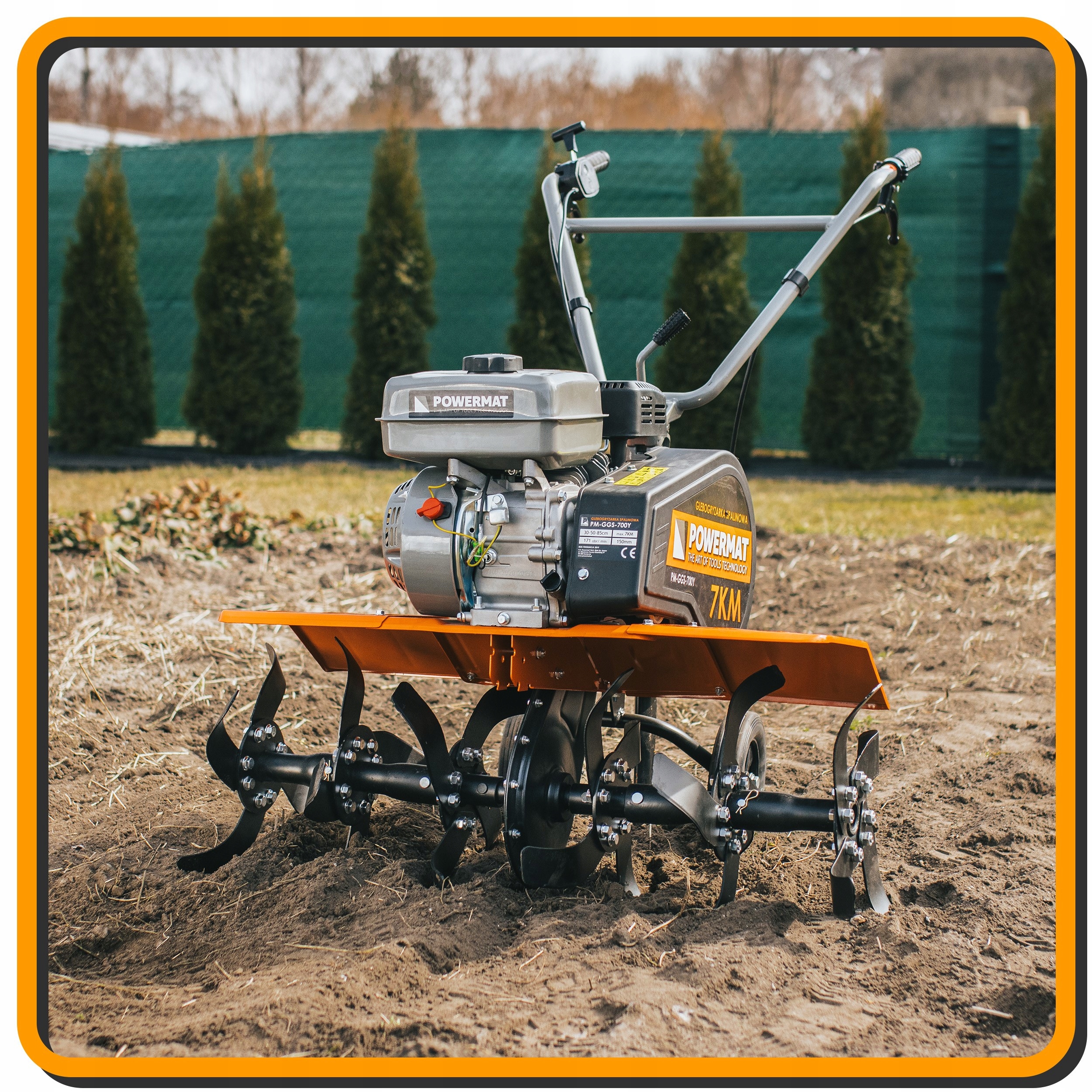 благодаря использованию двигателя внутреннего сгорания 7 км нам не будет отсутствия мощности даже в сложных условиях, прикрепленные водительские колеса сделают маневрирование устройства простым, а не требует большой силы пользователя. корректировка рабочей ширины.