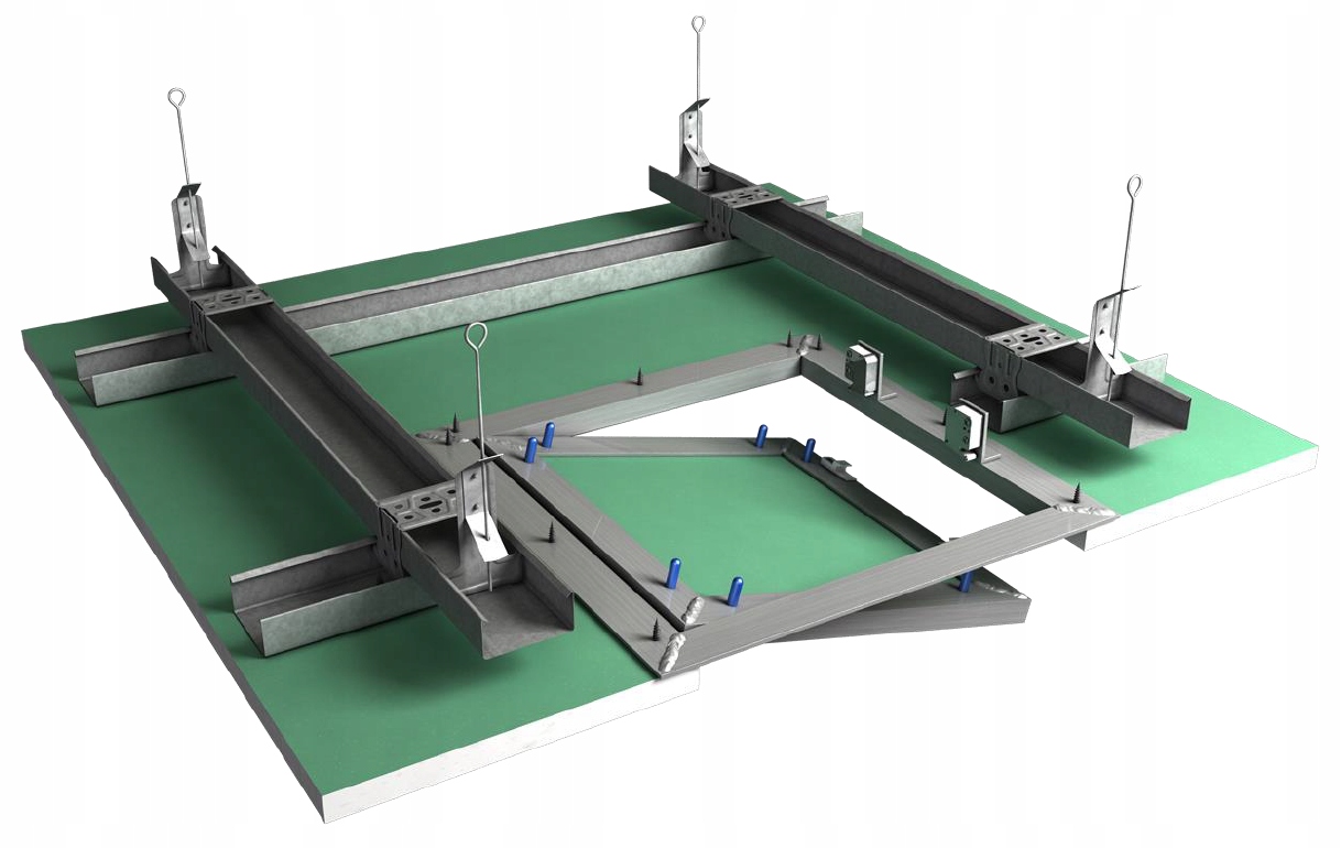 - Ревизионный люк из гипсокартона и специальных алюминиевых профилей, запрессованный во внешнюю и внутреннюю раму с помощью усиленных оцинкованных уголков. Полный узел не соединен постоянным шарниром, поэтому при необходимости плиту можно быстро и легко демонтировать.