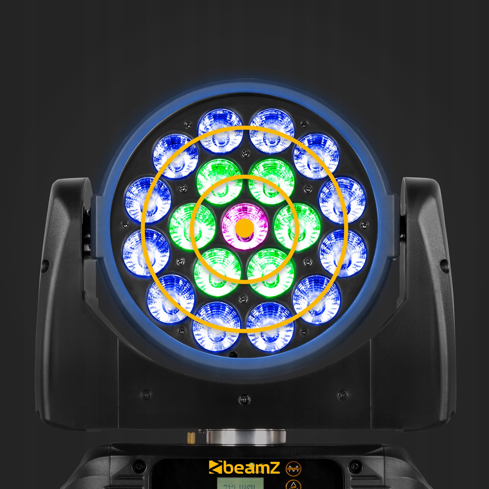 19 светодиодов FUZE1910 обеспечивают беспрецедентное количество света. Поскольку они разделены на 3 кольца, на самой движущейся голове можно создавать красивые эффекты. Светодиоды представляют собой светодиоды 4 в 1 красного, зеленого, синего и белого цветов. Смешивая эти цвета или играя с интенсивностью, с помощью этой движущейся головы можно создать огромное количество цветов, в том числе пастельных.