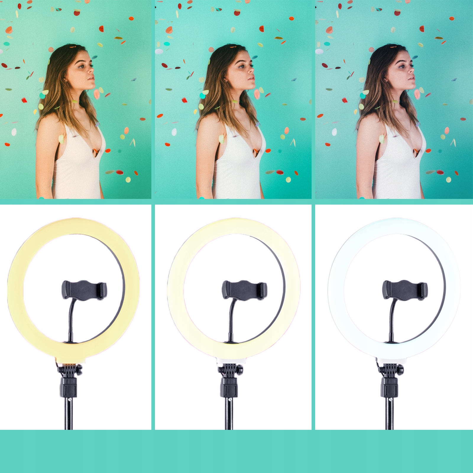 Кольцевой светильник имеет три настройки цветовой температуры (холодный белый, смешанный и теплый белый), которые можно менять в зависимости от желаемого эффекта.