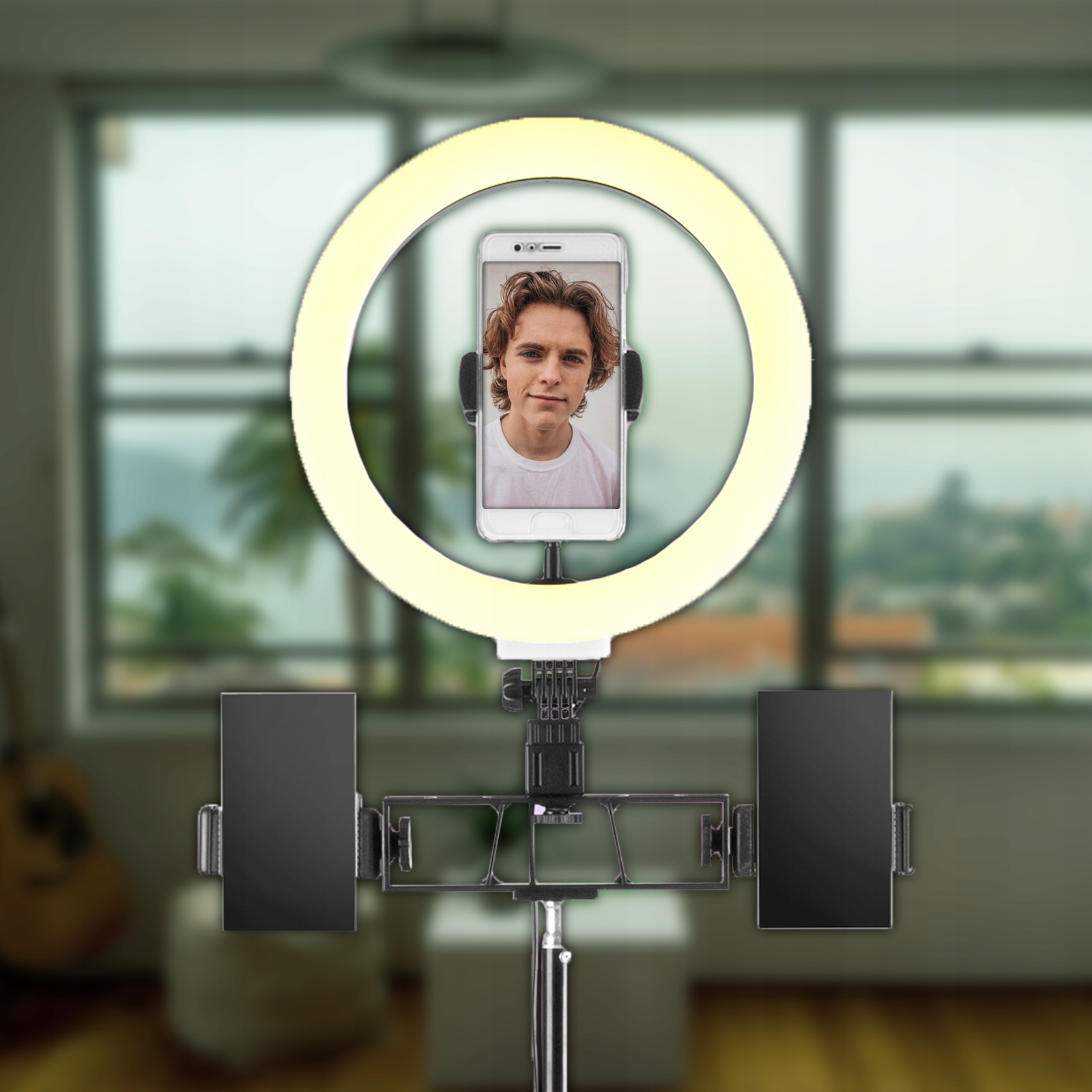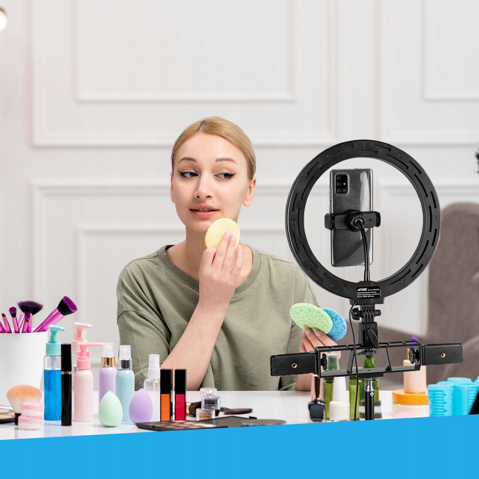 стоит на удобном штативе и имеет множество применений благодаря своей многофункциональности. Штатив оснащен двумя держателями для смартфона, что обеспечивает подходящий угол установки. Дополнительно у нас есть держатель для крепления внешнего микрофона для лучшего качества звука видеозаписей. У вас всегда будет нужный свет, ведь кольцевая лампа имеет 3-уровневую регулировку цветовой температуры и 10 уровней интенсивности света. Этот кольцевой светильник Vonyx идеально подходит для макияжа, фильмов, видеоблогов, обучающих программ, видеозвонков, видеороликов Snapchat и TikTok.