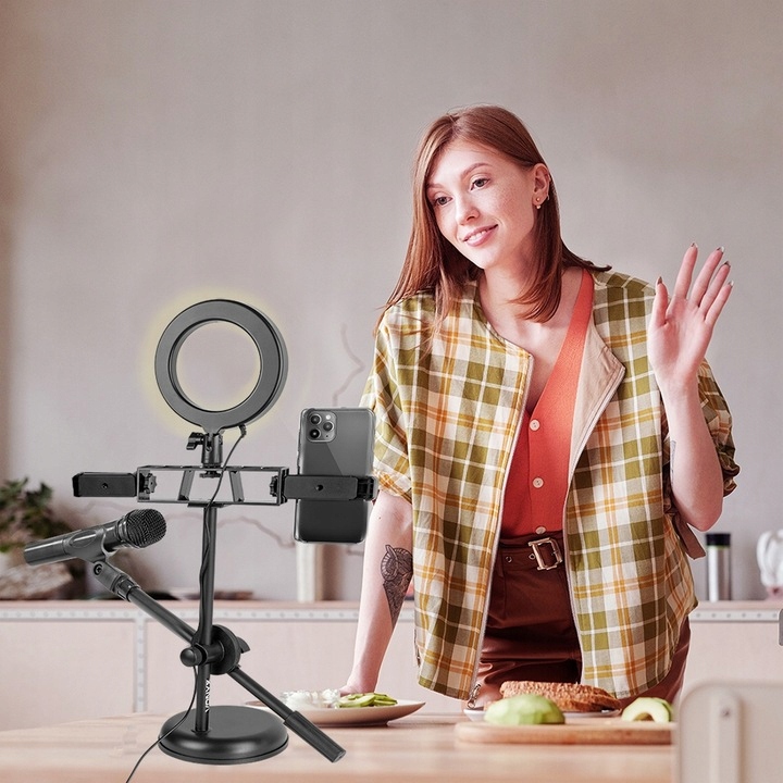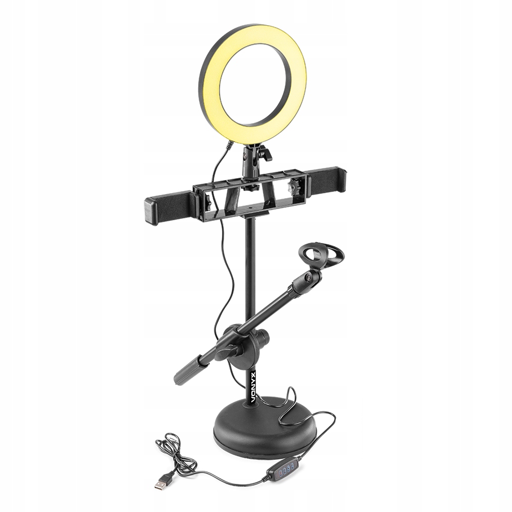 стоит на удобном штативе и благодаря своей многофункциональности имеет множество применений. Штатив оснащен двумя держателями для смартфона, что обеспечивает подходящий угол установки. Дополнительно у нас есть держатель для крепления внешнего микрофона для лучшего качества звука видеозаписей. У вас всегда будет нужный свет, ведь кольцевая лампа имеет 3-уровневую регулировку цветовой температуры и 10 уровней интенсивности света. Этот кольцевой светильник Vonyx идеально подходит для макияжа, фильмов, видеоблогов, обучающих программ, видеозвонков, видеороликов Snapchat и TikTok.