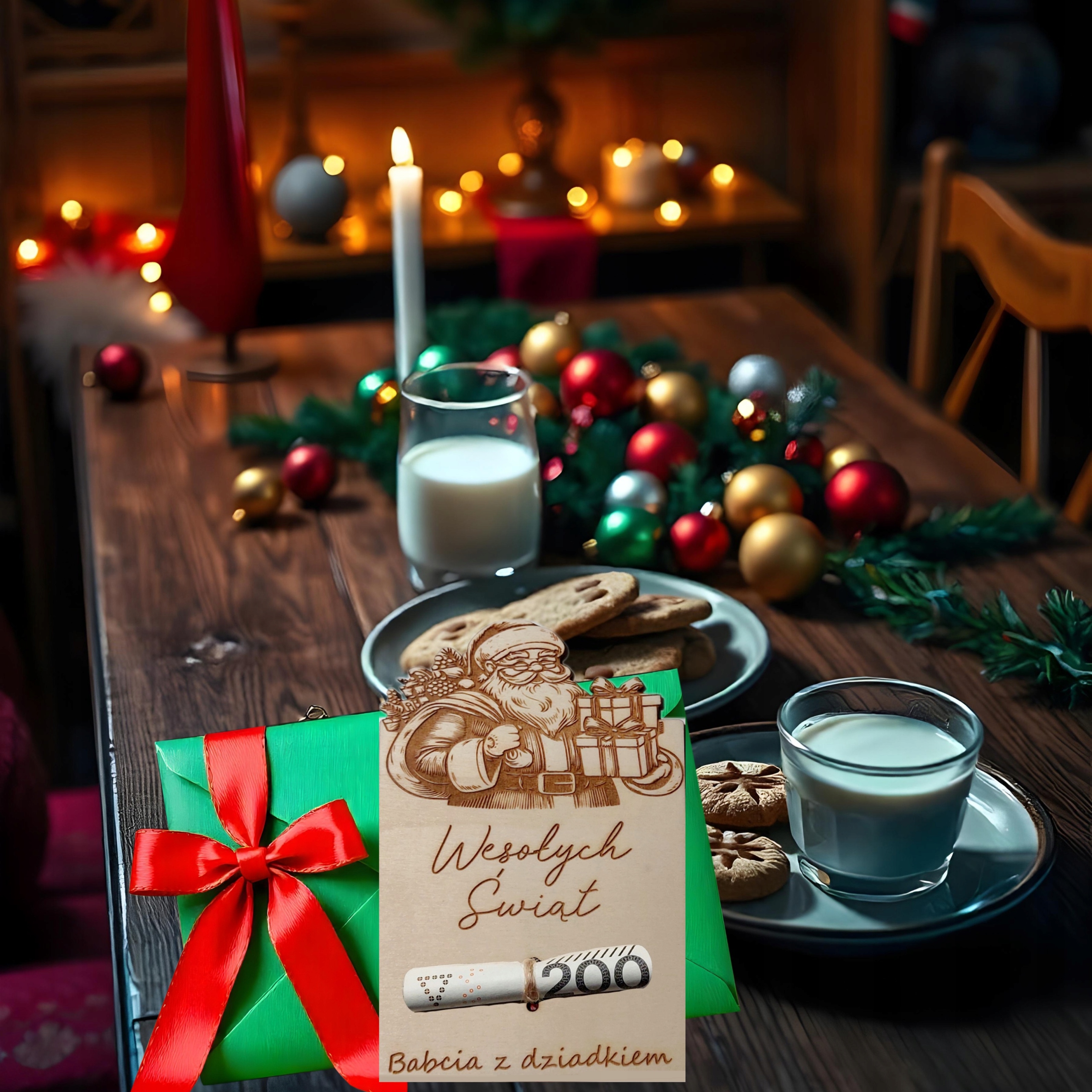 Ищете уникальный рождественский подарок, который будет выделяться среди традиционных решений? Наша деревянная открытка с изображением Деда Мороза с подарками и местом для купюры – отличная, оригинальная идея, которая удивит каждого получателя! Изготовленная из массива фанеры и украшенная тщательной гравировкой, она сочетает в себе элегантность и функциональность, являясь идеальной альтернативой бумажной открытке.