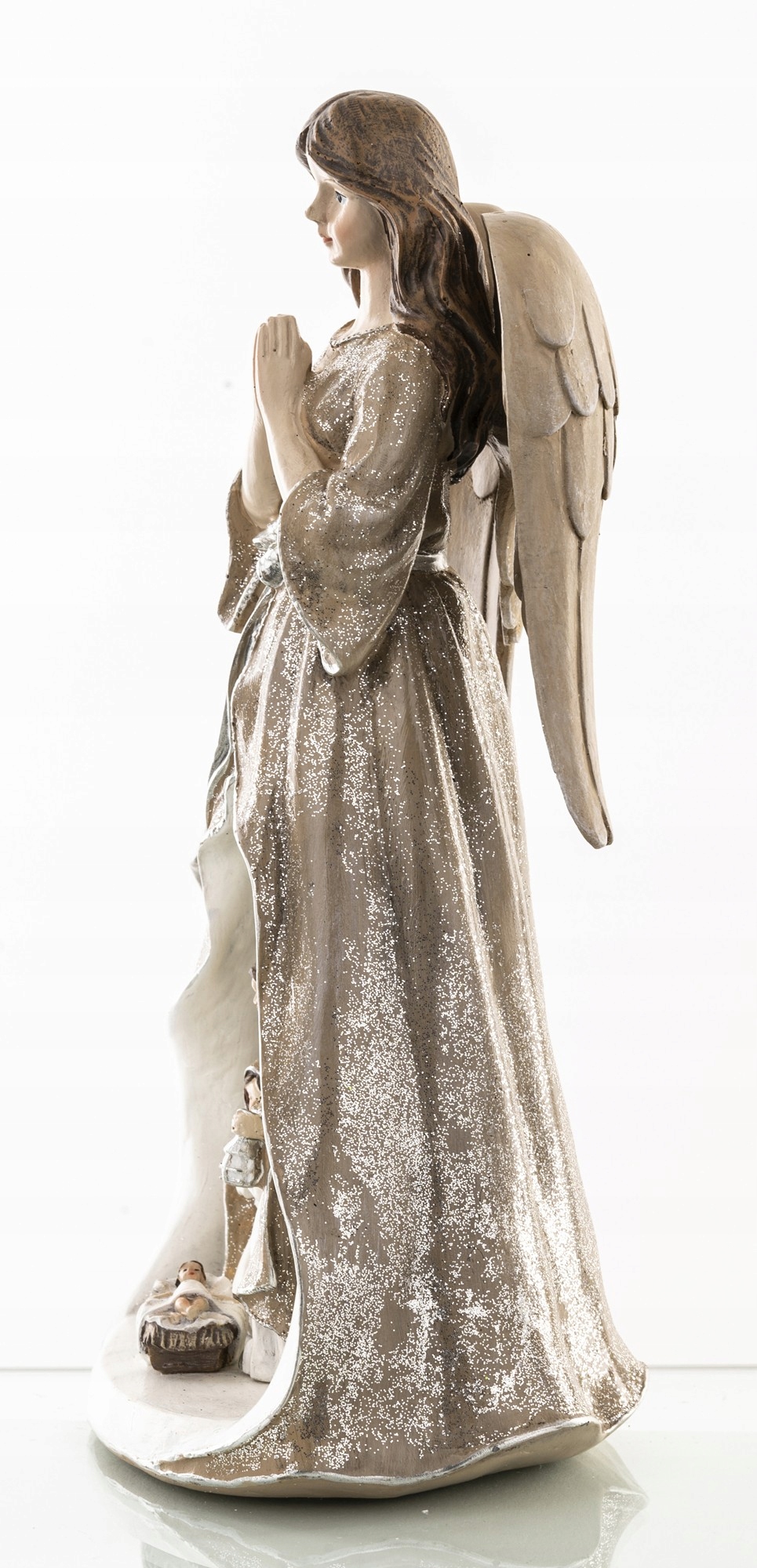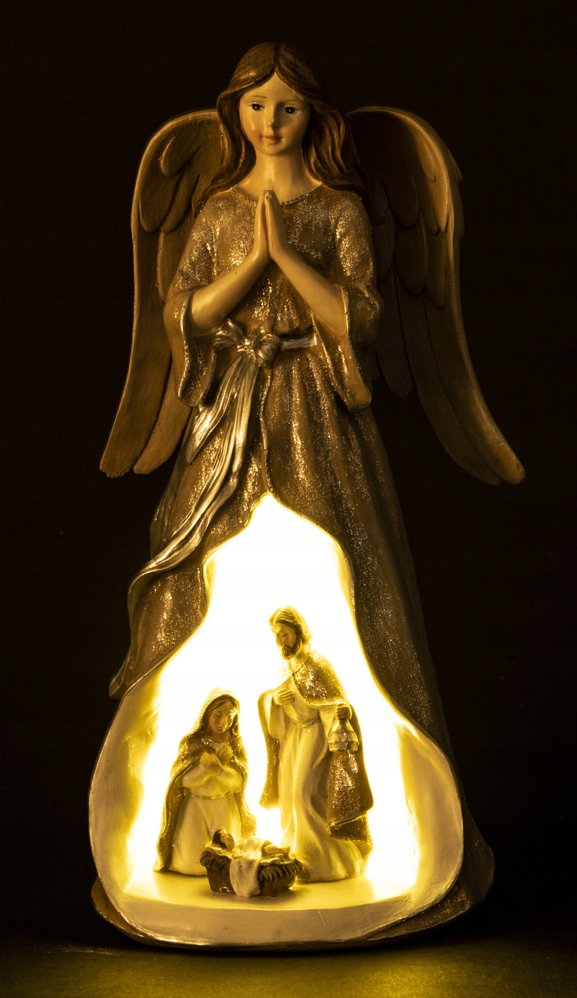 Красивая фигурка в качестве рождественского украшения, изображающая Ангела со Святым Семейством. Вертеп со светодиодной подсветкой, питание от батареек (2x LR44). Фигурка изготовлена из пластика. Это отличный подарок для Ваших близких.