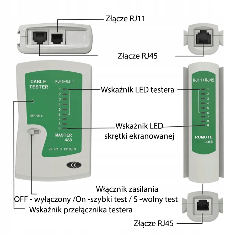 Устройство для проверки правильности подключения сетевых кабелей, поддерживает вилки RJ45, RJ11 и RJ12. Он сигнализирует о правильном подключении с помощью светодиодов. Питание от аккумулятора 6F22 9 В (не входит в комплект)