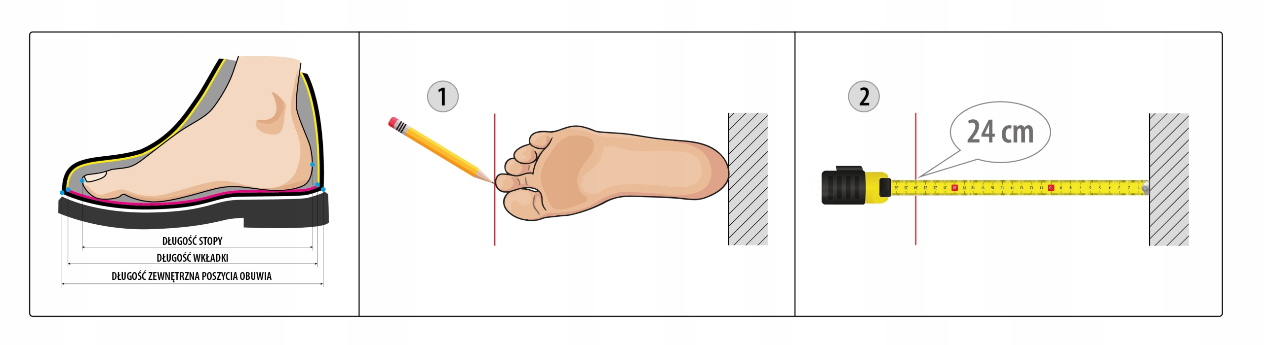 Каждая серия обуви, которую мы предлагаем, имеет европейские размеры, однако из-за небольших различий в процессе производства имеются небольшие различия в длине стелек. для заданного размера. Чтобы подобрать размер обуви по вашей ноге, измерьте ее согласно инструкции ниже, а затем выберите размер по параметрам длина стельки и длина стопы. Представленный параметр длина стопы представляет собой приблизительную длину стандартной конструкции стопы.