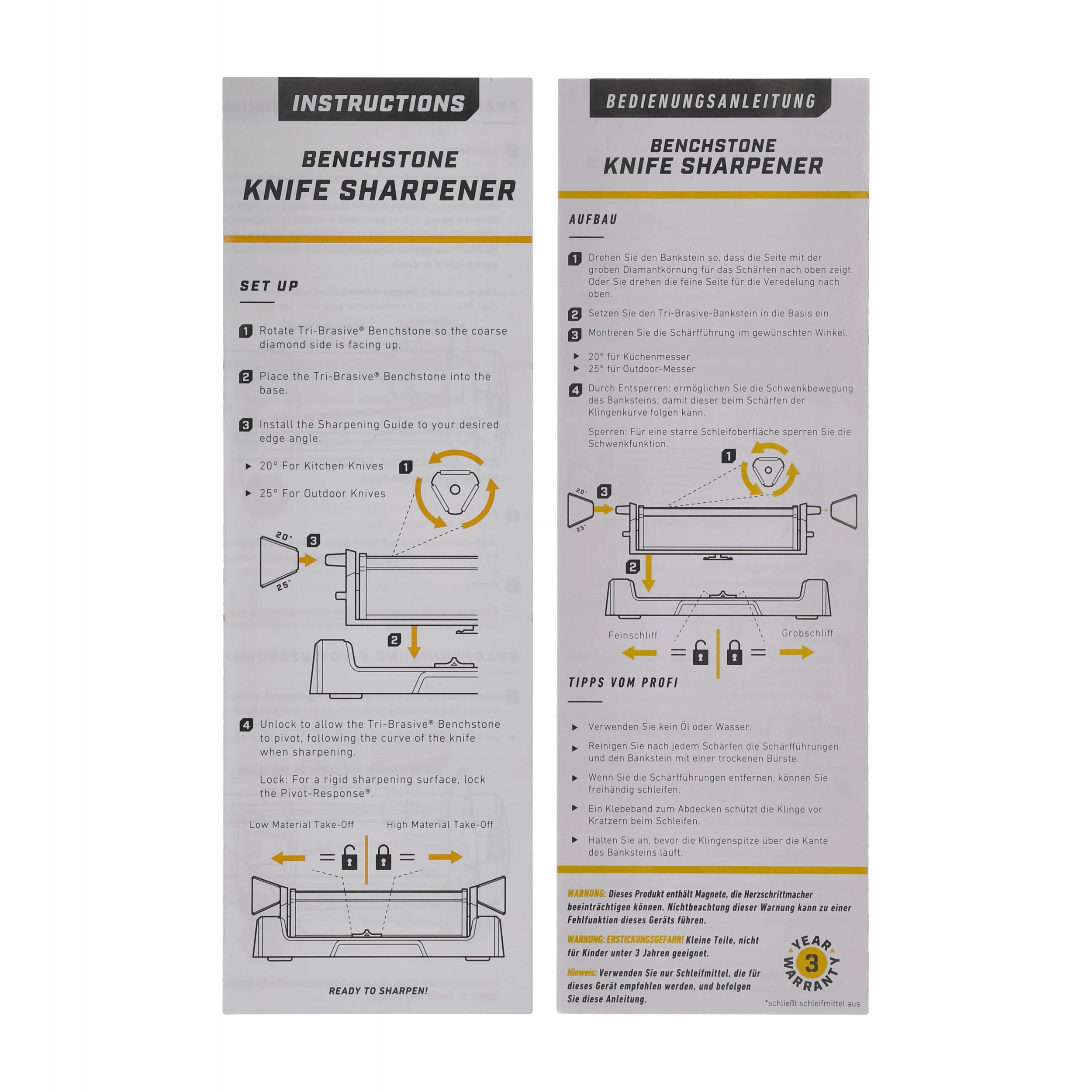 Работающая резкая заточка из стендона оснащена угловальными направляющими (монтируется на магните) с наклоном 20 ° и 25B> °. Поместив лезвие ножа в гид, все, что вам нужно сделать, это равномерно перетаскивать Kling на тарелку с фиксированным углом.