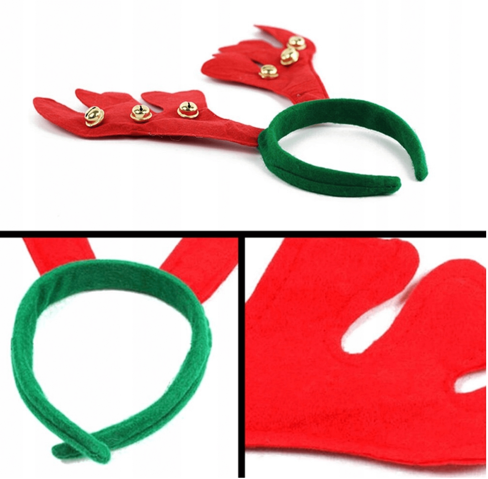 Резинка обшита мягким зеленым материалом. К каждому рожку прикреплено по три колокольчика, которые издают нежный звук при движении головой. Рождественские краски и колокольчики создают чудесное рождественское украшение.