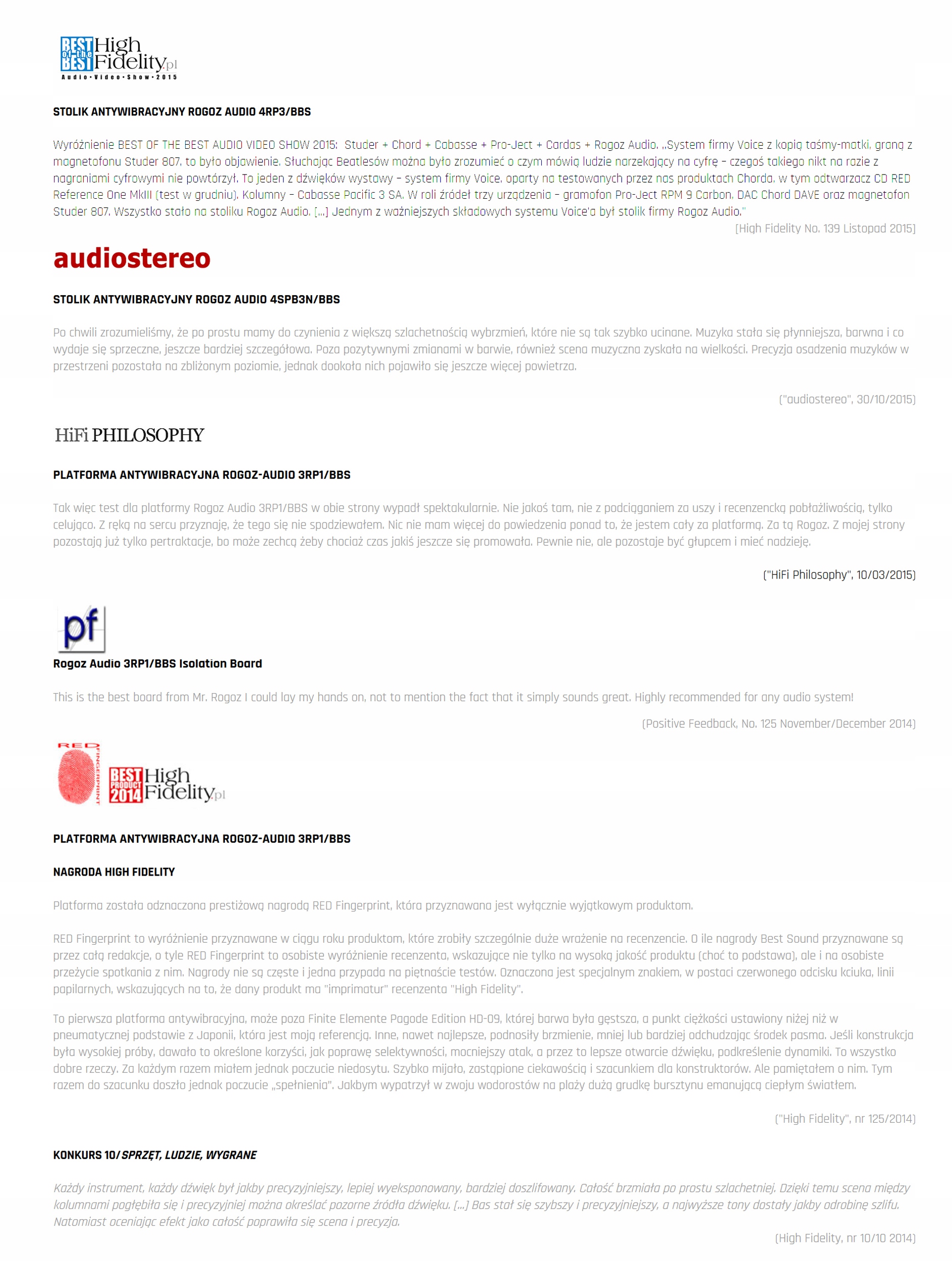 Награда «ЛУЧШЕЕ ИЗ ЛУЧШИХ АУДИО-ВИДЕО-ШОУ 2015»: Studer + Chord + Cabasse + Pro-Ject + Cardas + Rogoz Audio. «Система Voice с копией мастер-ленты, проигрываемой с магнитофона Studer 807, стала настоящим открытием. Слушая «Битлз», можно было понять, о чем говорили люди, жалующиеся на цифру – никто никогда не повторял ничего подобного с цифровыми записями. Это один из звуков выставки — система от Voice, основанная на протестированных нами продуктах Chord, включая CD-плеер RED Reference One MkIII (тестировался в декабре). Колонны – Cabasse Pacific 3 SA. Источниками служили три устройства — проигрыватель Pro-Ject RPM 9 Carbon, ЦАП Chord DAVE и магнитофон Studer 807. Все было размещено на стойке Rogoz Audio. [...] Одним из важнейших компонентов системы Voice была стойка Rogoz Audio». [High Fidelity №139, ноябрь 2015 г.]