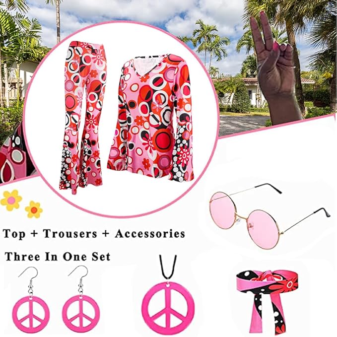 - 【Комфортно Материал 】Эта одежда хиппи 70-х годов с хорошим дизайном, изготовленная из красивого, легкого и дышащего материала, мягкая, удобная в ношении, а также легко сохнет. Костюмы хиппи мягкие и эластичные, благодаря чему талия и ноги кажутся стройнее. Он идеально сидит на вас, не тесный, не чешется и не горячий. Очень красивый женский костюм в стиле 60-70-х годов, идеально подходящий для вечеринки в стиле хиппи или для повседневного использования.