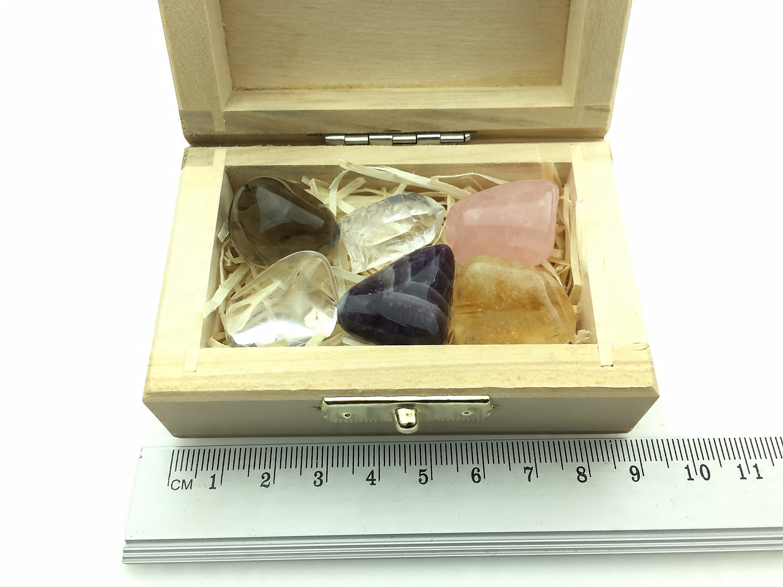 НОВИНКА Набор из 6 кварцевых камней натуральной огранки (5 шт. + необработанный кристалл) высокого качества в практичной деревянной коробке. Идеально подходит для подарка.