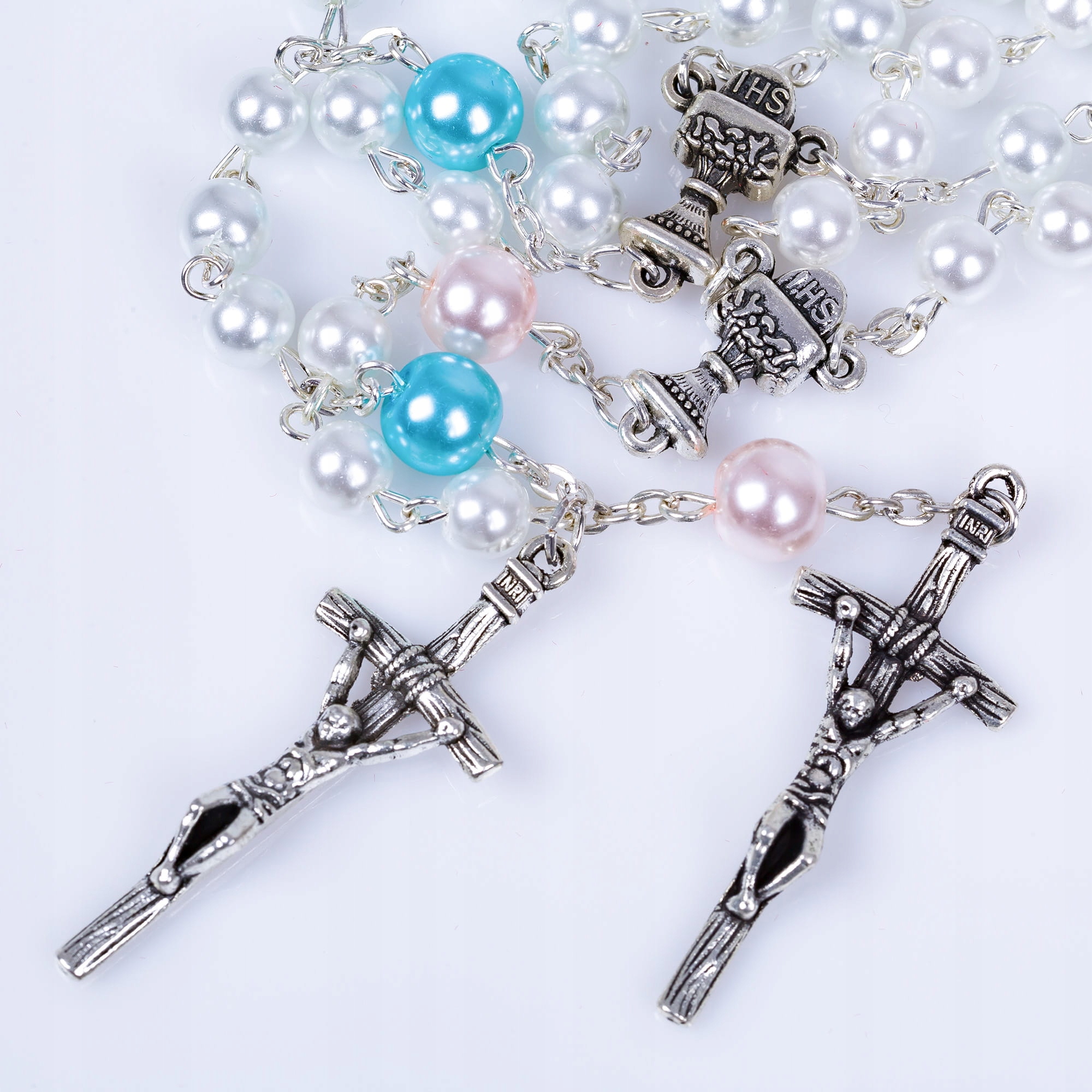Бусины диаметром 6 мм и 8 мм с коннектором с изображением хозяина с надписью IHS. Четки станут не только прекрасным подарком к Первому Святому Причастию, но и инструментом для красивой детской молитвы.