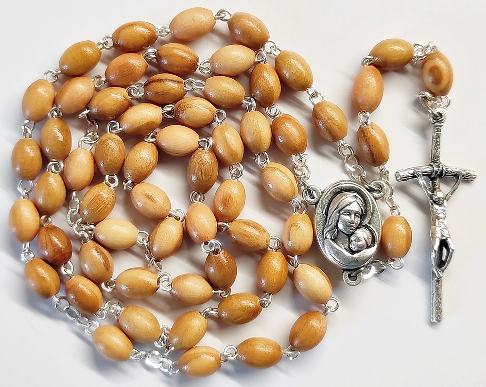 Розарий, изготовленные вручную из оливкового дерева, как бусина, так и крест. подробности. С одной стороны, медаль с изображением матери Божьей, с другой с частицами Святой Земли. Комплекс)