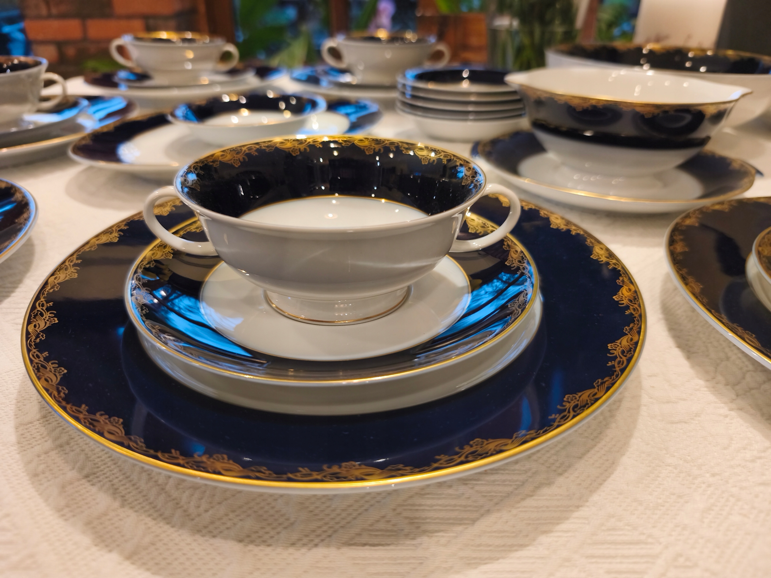 Обслуживание на ужин для 7 человек с фарфорового лейбла Розенталь. Фасон Аида. Снежный фарфор, украшенный широким кобальтовым поясным поясом, на котором был применен декоративный золотой рисунок. Зенакомиты условия без каких -либо недостатков и признаков использования. MISA, два продольных пластера, блюдца на основе 7 плоских пластин, 7 луковиц с захватами Stand Bulionae, 7 мисок, композиций. Я рекомендую этот красивый фарфор авторитетного лейбла в элегантном украшении. В этом разрезе AIDA в этом украшении также чайный сервис.
