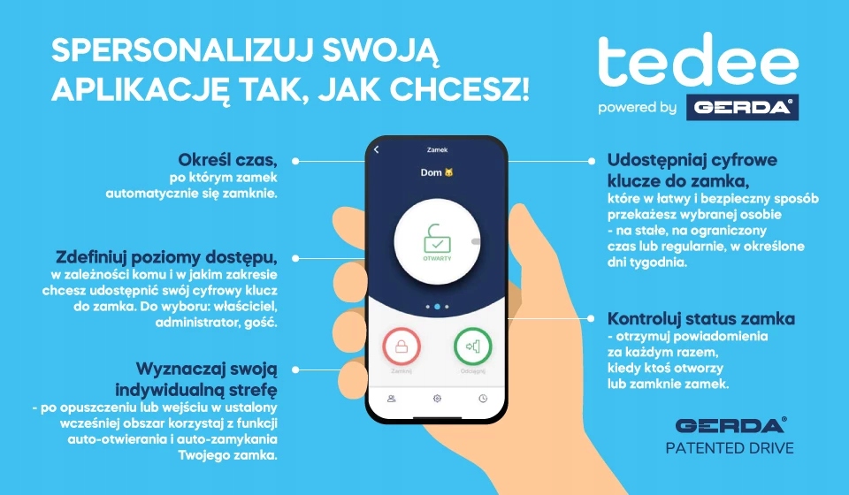 ...включая Google Home, Amazon Alexa, Homey, FIBARO, Grenton и Ampio. Вы можете управлять блокировкой tedee GO с помощью голосовых помощников, таких как «Эй, Google» или Amazon Alexa, на совместимых устройствах или через приложение «Ярлыки» с Siri. Хотите закрыть, открыть или проверить состояние двери? Просто спросите!