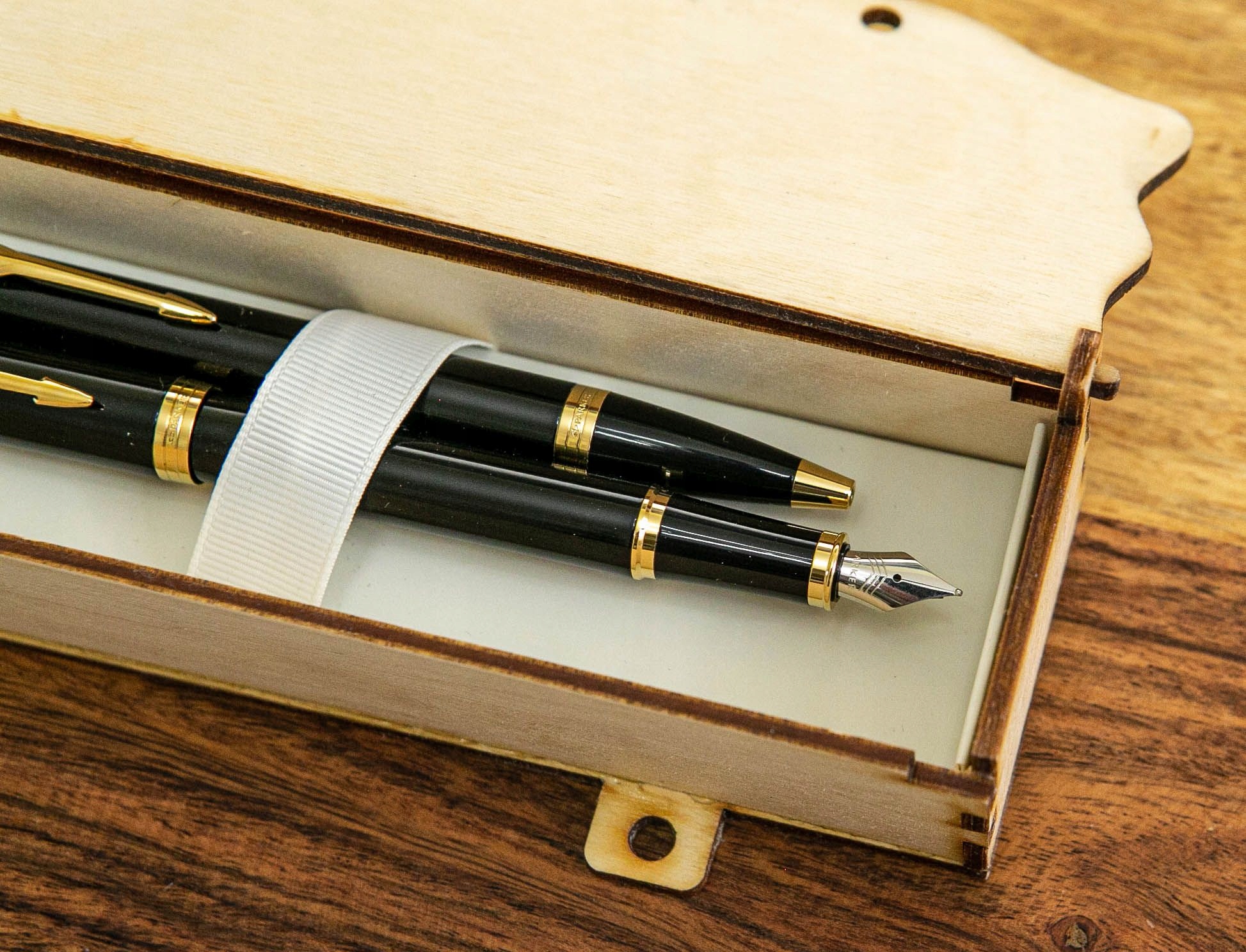 Перьевая ручка и шариковая ручка Parker IM, черный цвет, в деревянной подарочной упаковке и гравюрами.