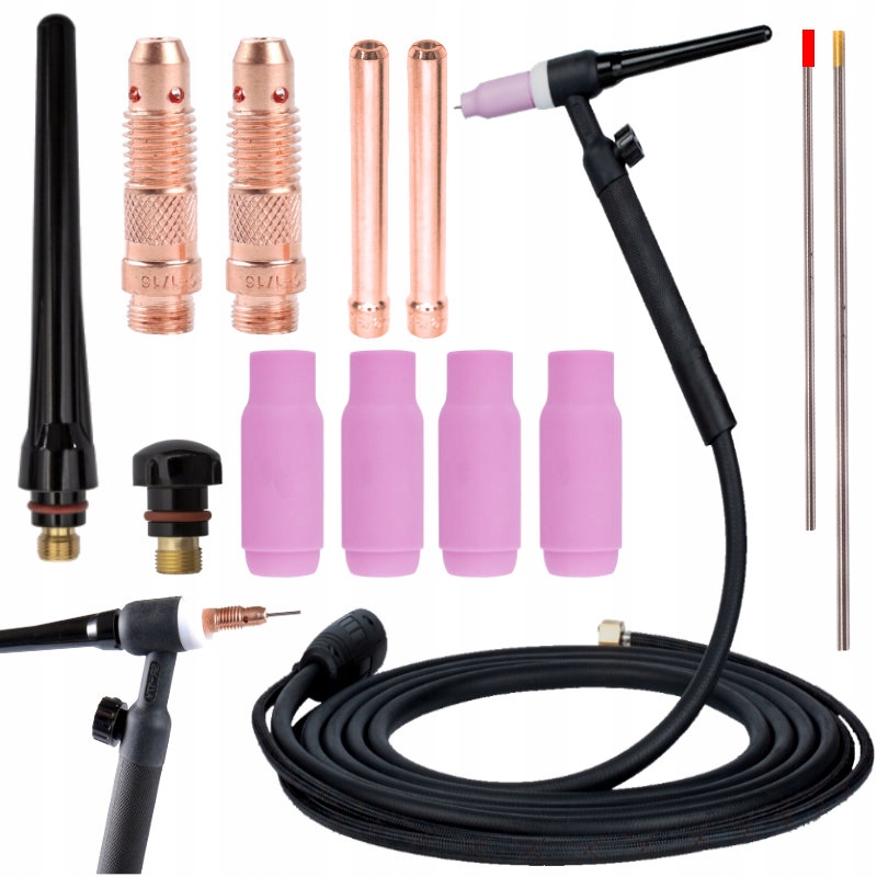 Помимо рукоятки и баллона с аргоном (+газовый шланг + хомуты + переходник) мы предлагаем Вам 2 полных универсальных набора принадлежностей для сварки электродом диаметром 1,6 мм и 2,4 мм.В комплект входят: электрод, зажимная втулка, токовый разъем, 4 газокерамические насадки, 2 заглушки (длинная и короткая).