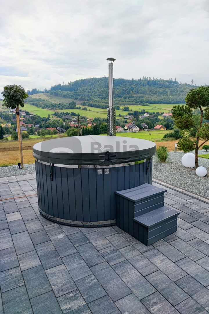 - Уличная печь из нержавеющей стали AISI 304 с 2-метровым дымоходом и крышей. В комплект входят все необходимые подключения для гидромассажной ванны.