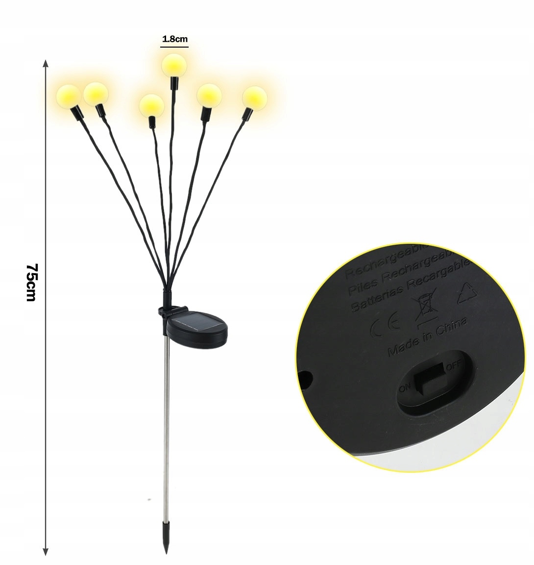 Светодиоды расположены таким образом, что напоминают мигающий фейерверк. В тонкой, черной земляной пещере, на полпути вверх, как платформа, размещен солнечный модуль, оснащенный аккумулятором, обеспечивающим свечение фонарей в темноте. Лампа управляется сумеречным датчиком, который включает ее вечером и снова выключает утром. Яркие огни светодиодной сети создают прекрасный световой акцент в саду.