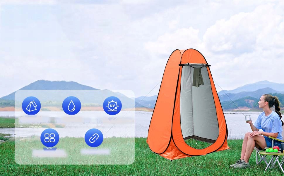 ⏩⏩ Конфиденциальность и высокое качество всплывающая душевая палатка изготовлен из полиэфирного и серебряного водонепроницаемого покрытия с устойчивой к разрыву, который блокирует 80% вредных UPF 40+ ультрафиолетовых лучей и защищает от случайного горящего солнца. Водонепроницаемый полиэстер сохраняет лагерь в сухости и обеспечивает долговечность. Серебряное покрытие характеризуется более слабой проницаемостью света и увеличивает конфиденциальность ванны. Он содержит гибкую стальную раму для самой высокой долговечности, его нелегко сломать и защищать от коррозии.