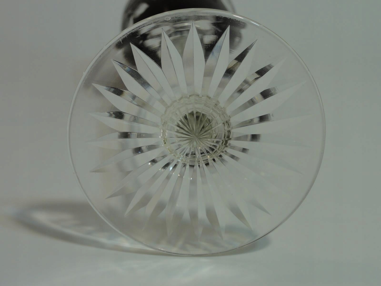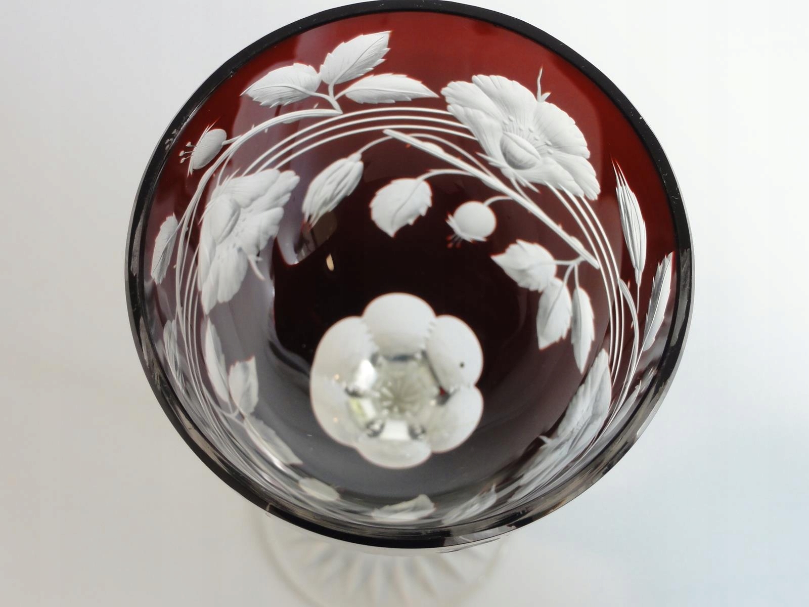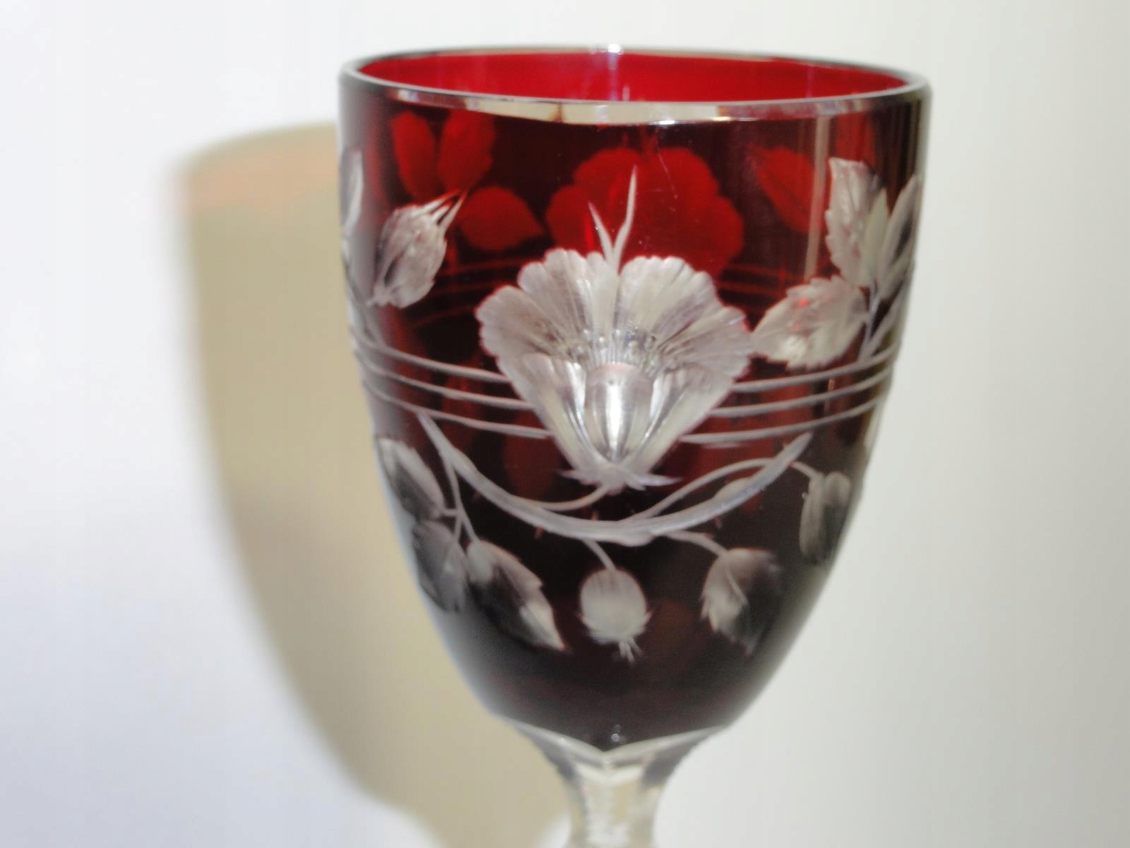 *бокал из свинцового стекла, выдутого в форме, ограненного и полированного, рубиновое покрытие, столбчатое древко, рифленые края, основание с розеткой,