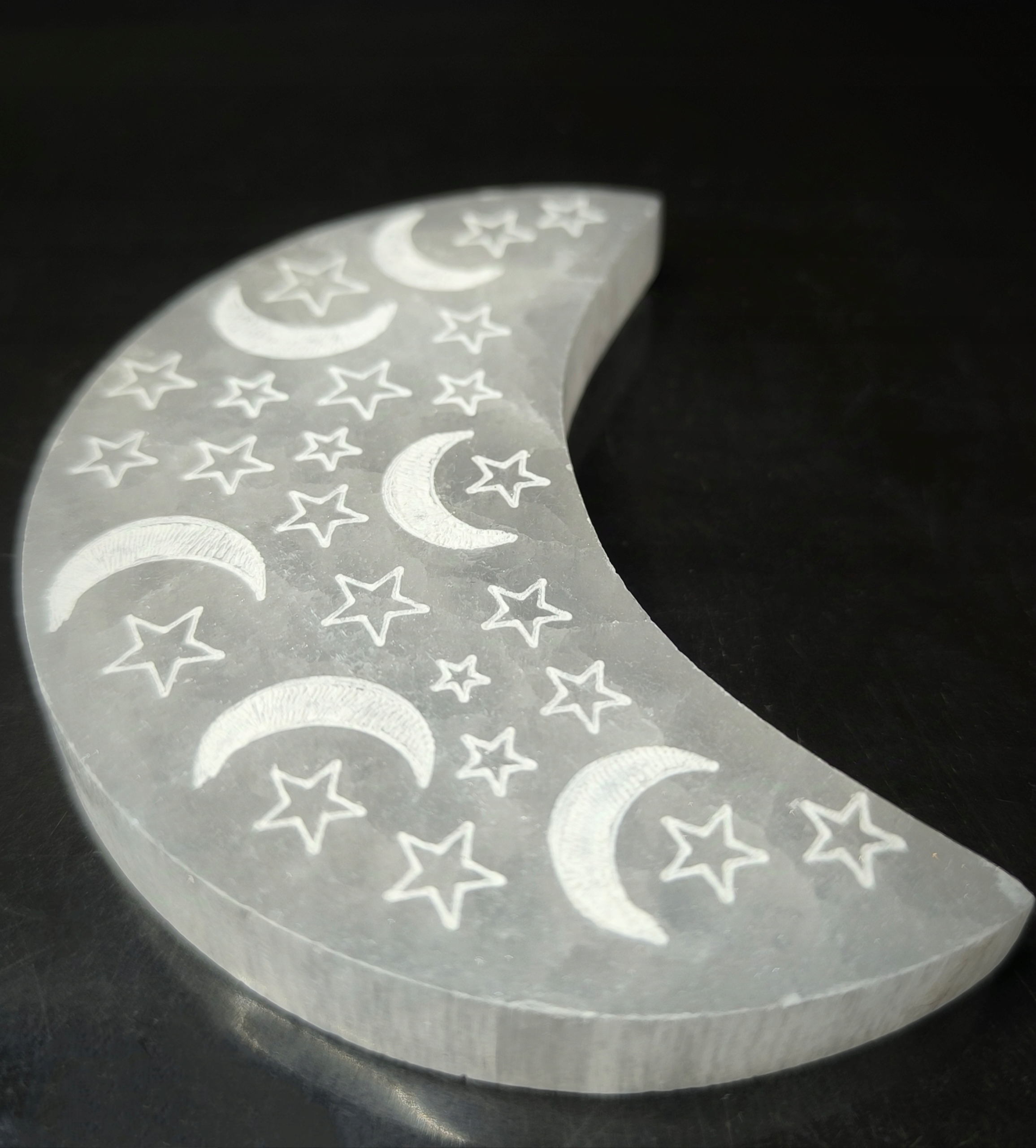 Луна из селенита 10 см, гравировка, натуральный марокканский лунный камень