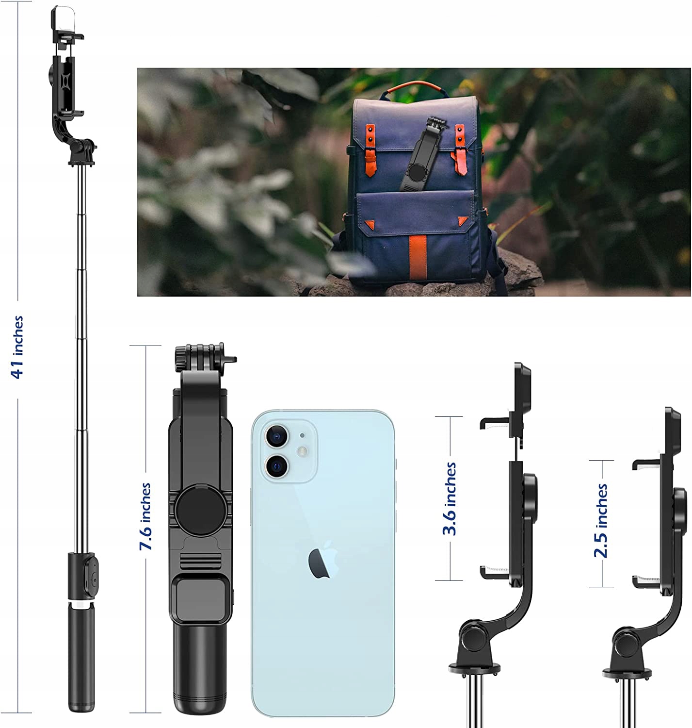 --Удлиняемый до 41 дюйма, этот элемент обеспечивает значительное количество места, необходимого для выстрелы на дальние дистанции. Длина палки для селфи в сложенном виде составляет примерно 7,6 дюйма.
