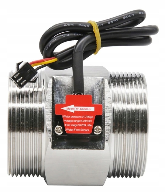 Проточный измеритель имеет три кабеля: черный - минус источник питания, красный - плюс питание, желтый кабель - это сигнальный кабель