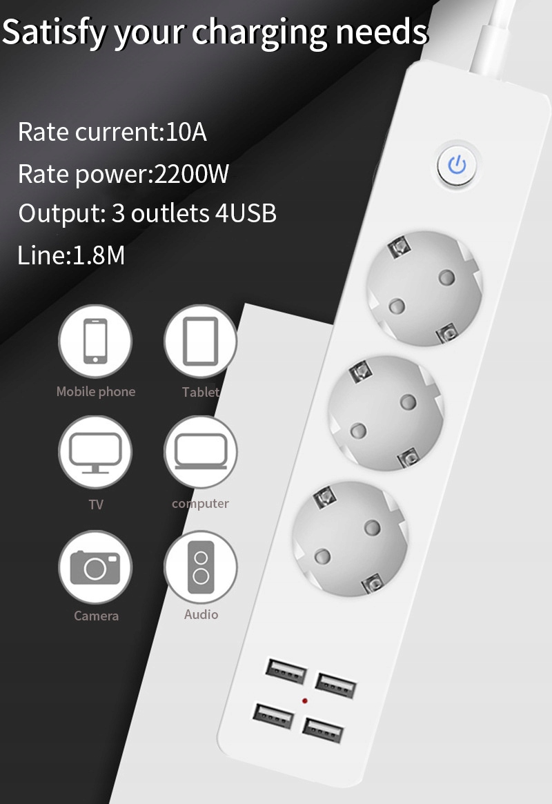 SFC08-1 2200W 10A EU Listwa zasilająca 3 gniazda 4USB z przedłużaczem 1,8M