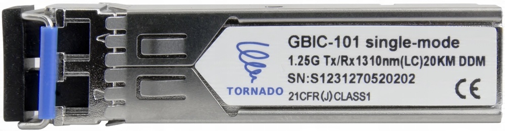 Вставка GBIC-101 «Торнадо» представляет собой модуль, предназначенный для передачи данных по двойному (дуплексному) одномодовому оптоволоконному кабелю (СМ) на расстояние до 20 км. Длина волны передачи 1310 нм, скорость передачи 1,25 Гбит/с.