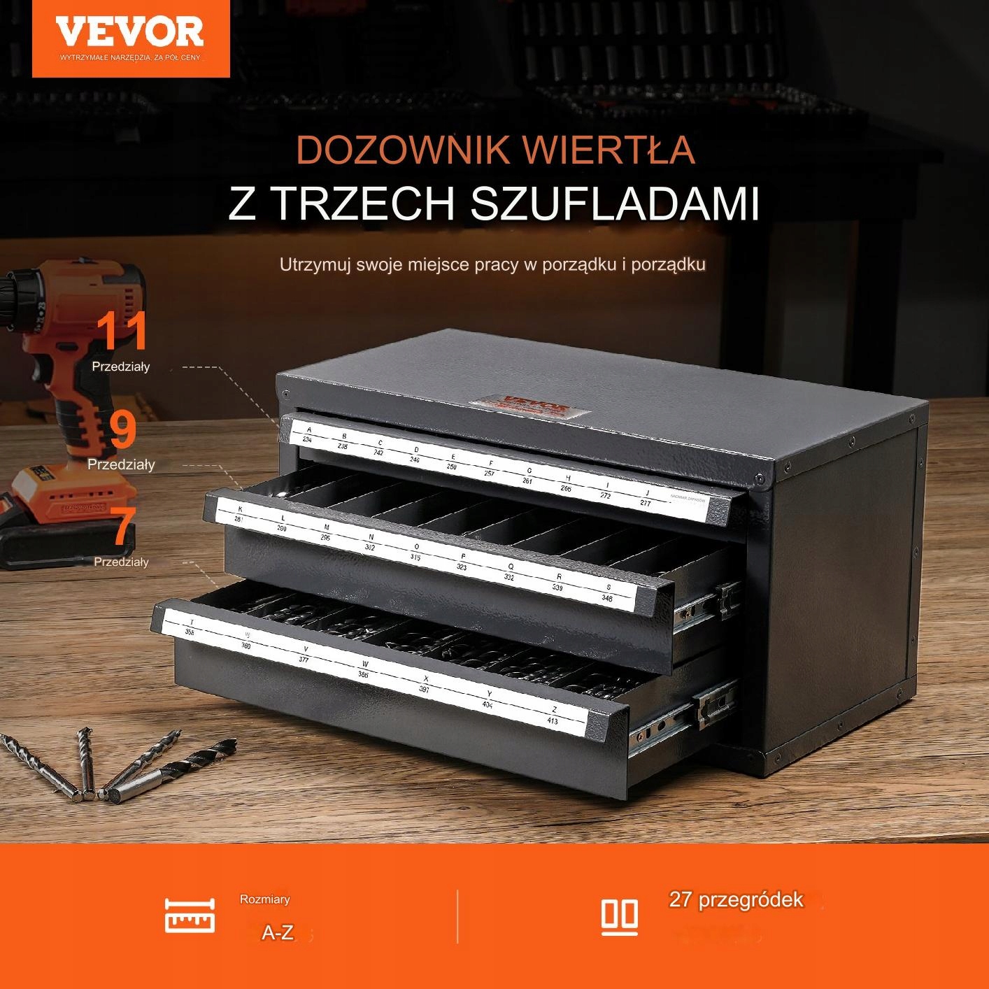 Этот шкаф с тремя ящиками, 27 отделениями и дозатором сверл позволяет легко хранить коллекцию сверл. В него поместятся дрели размером от А до Я. Маркированные отсеки позволяют быстро идентифицировать и упорядочить их.