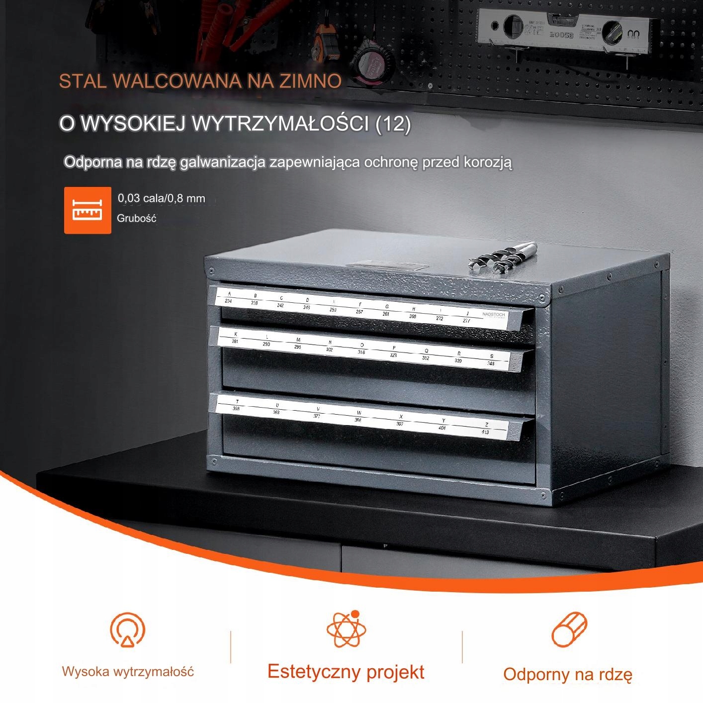 Диспенсер для сверл изготовлен из холоднокатаной стали толщиной 0,8 мм с гладкой поверхностью, обеспечивающей привлекательный блеск и высокую прочность поверхности. Гальваническое покрытие обеспечивает поверхность, устойчивую к деформации, ржавчине и коррозии.