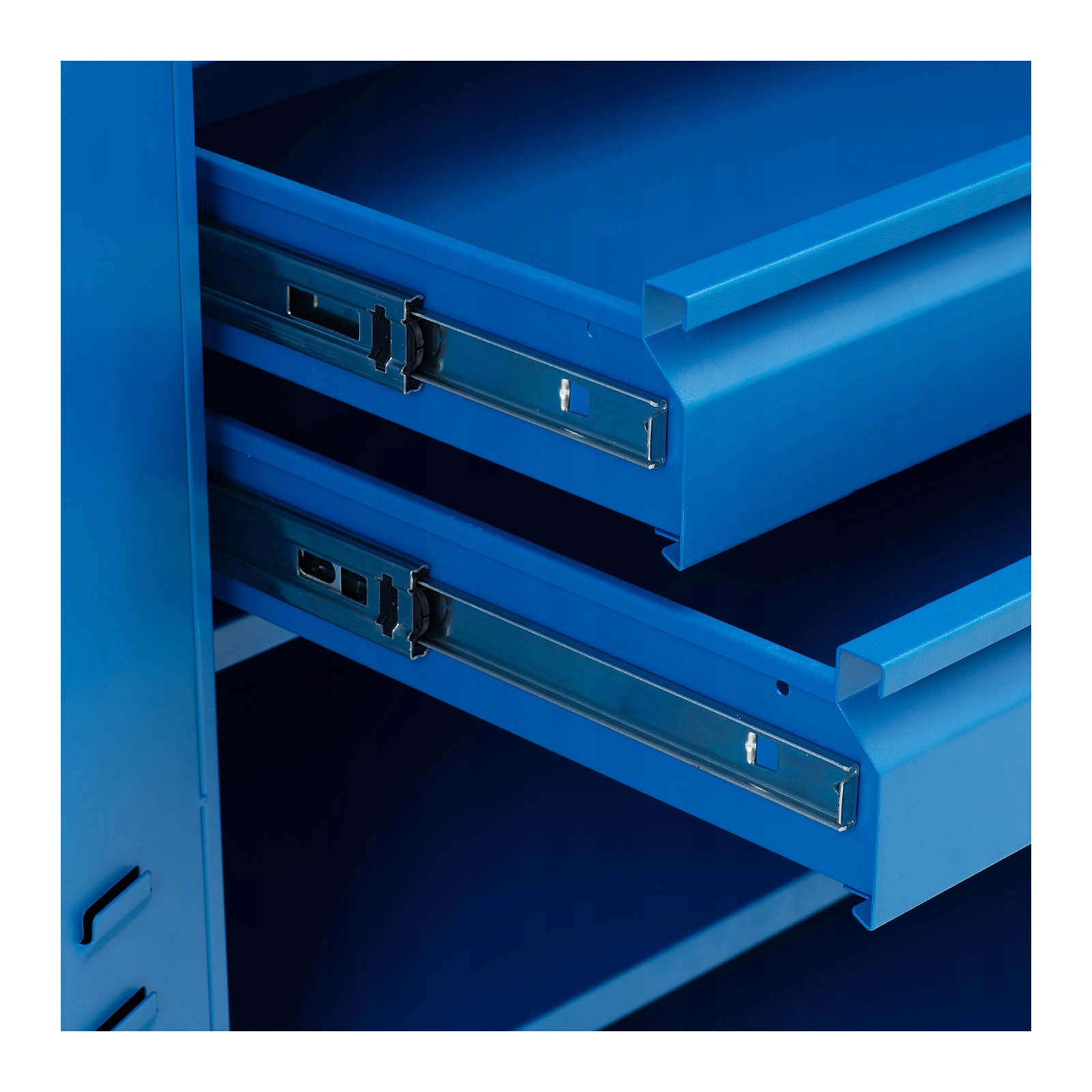 Металлический шкаф с 2 ящиками обеспечит необходимое место для хранения вещей в вашей мастерской. Ящики имеют разные размеры, поэтому в них можно поместить как крупные, так и мелкие предметы. Они также чрезвычайно устойчивы и выдерживают нагрузку от 45 до 50 кг, поэтому идеально подходят для хранения тяжелых металлических предметов. Общая грузоподъемность шкафа – до 300 кг. Мебель для мастерской также имеет перфорированную заднюю стенку и две распашные дверцы, в которых также есть отверстия, на которые можно повесить инструменты для экономии места. Крупногабаритные приборы можно разместить на полке над ящиками или использовать нижние полки, средняя регулируется и имеет грузоподъемность 100 кг.