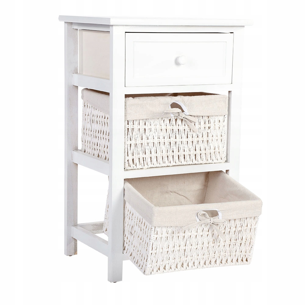Деревянный шкаф с ящиком и плетеными корзинами, изготовленными из струны, выложенной хлопковым материалом.