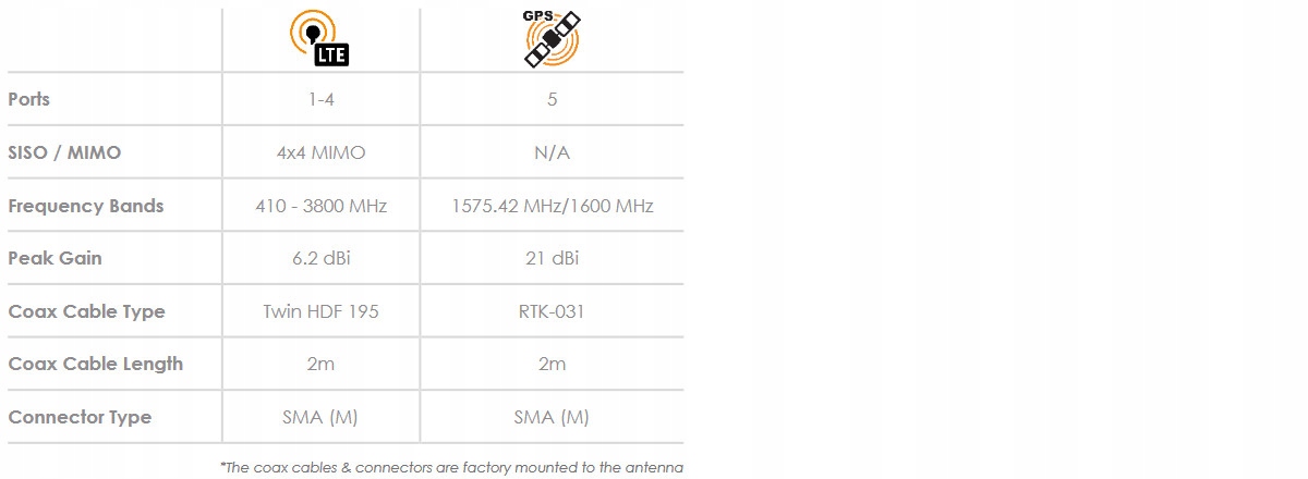 MIMO-3-14 — это высокопроизводительная многочастотная антенна 5-в-1, оснащенная четырьмя сотовыми антеннами и антенна GPS/ГЛОНАСС. Четыре сотовые антенны MIMO (для 2G/3G/4G) охватывают современные диапазоны частот от 690 МГц до 2700 МГц, а также новый спектр LTE и 5G для диапазонов CBRS 450 МГц и 3,5 ГГц, который становится популярным в различных международных сетях LTE-телефонов. Сверхширокополосные характеристики антенны позволяют использовать ее различными операторами и технологиями, а также она готова к будущим сотовым технологиям до 3,8 ГГц для приложений 5G. Пятая антенна представляет собой высокопроизводительную активную систему GPS/ГЛОНАСС, работающую при температуре до -40°C. MIMO-3-14 превосходит большинство конкурентов благодаря вниманию к конструкции этой высокопроизводительной антенны. Диаграммы излучения всех излучающих элементов обеспечивают превосходный баланс между всенаправленностью, разнообразием диаграмм направленности и хорошими возможностями излучения на желаемой высоте. Это важный критерий для транспортного и морского рынка. для которых антенна была специально разработана. Основными приложениями являются коммерческие/промышленные транспортные средства, морские суда, M2M и другие системы Интернета вещей, использующие широкий спектр радиотехнологий, сохраняя при этом будущее в широком диапазоне частот.