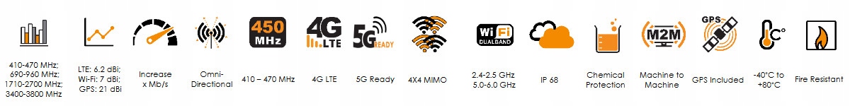 - Сверхширокополосные диапазоны частот от 410 до 470 МГц, от 690 до 2700 МГц и от 3400 до 3800 МГц