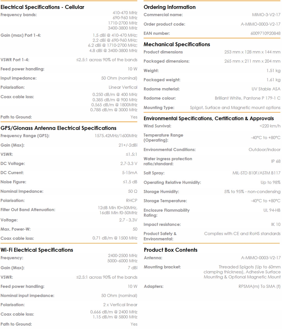 - Независимость от земли плоскость: MIMO-3 имеет внутреннюю плоскость заземления, благодаря чему антенна подходит для использования на всех типах поверхностей
