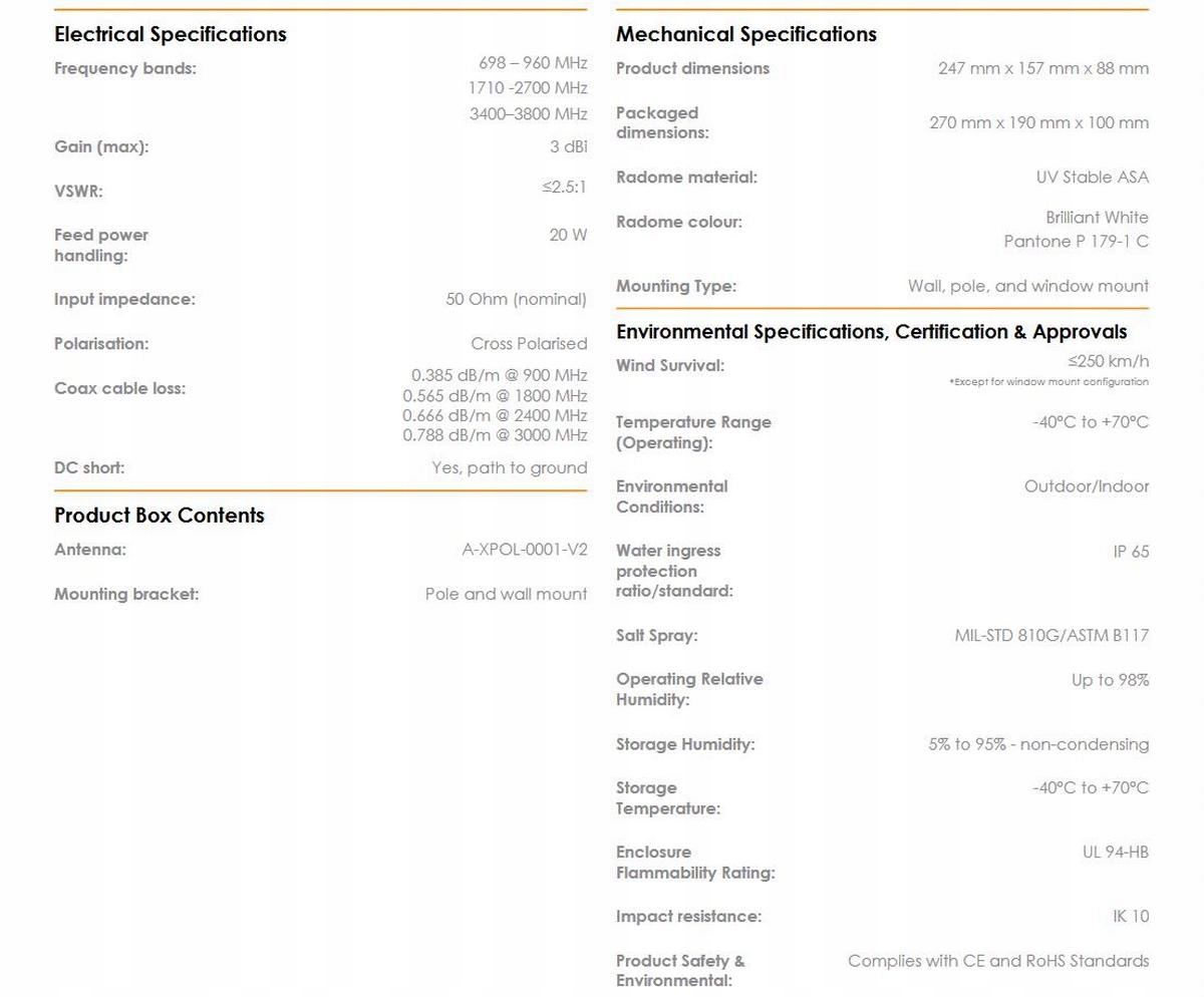 - Сверхширокополосный рабочий диапазон от 698 до 960 МГц, от 1710 до 2700 МГц и от 3400 до 3800 МГц;